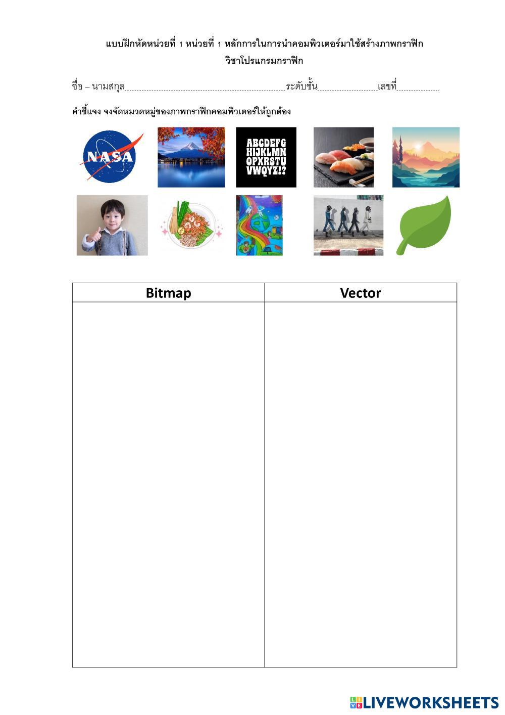 Created byWeerapon Ponnikai graphic graphic Age 12+ level: ปวช. Thai Author's Instructions My Google Classroom Courses × 0 classes selected (0 students total) Quick Access Select all classes (0 classes) All Classes Loading courses... Cancel Share Share to selected Course __COURSE_NAME__ __STUDENT_NAME__ (__STUDENT_EMAIL__) แบบฝึกหัดหน่วยที่ 1 หลักการในการนำคอมพิวเตอร์มาใช้สร้างภาพกราฟิก Download Worksheet Validation Check my answers Emails my answers to my teacher Full name Group/level School subject Teacher's email or key code Close Submit Validating worksheet... (12) Your answers have been sent to your teacher. Good luck! OK We encountered an error submitting your answers. Please try again. OK Advertisement | Go Ad Free Created byWeerapon Ponnikai graphic graphic Age 12+ level: ปวช. Thai Author's Instructions