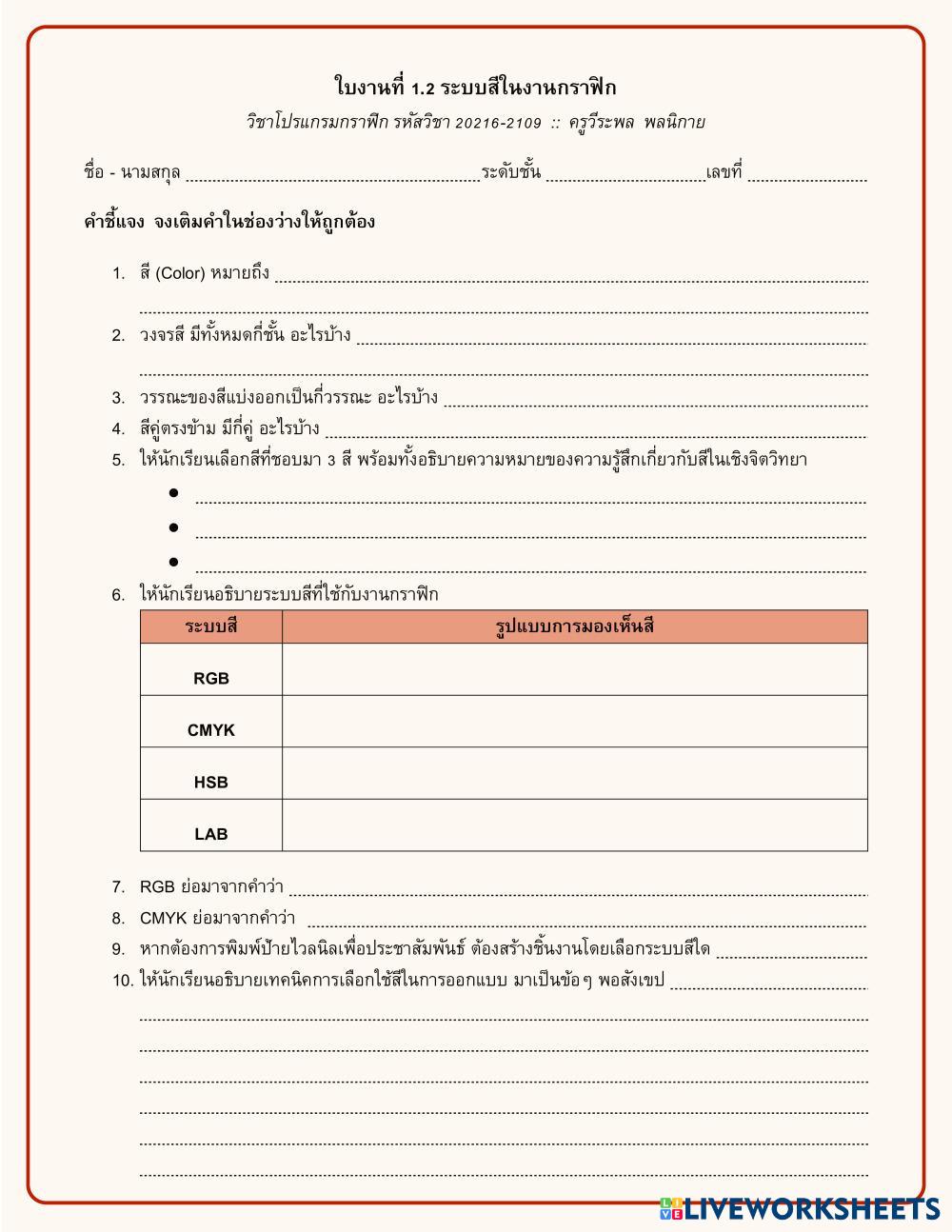 Created byWeerapon Ponnikai graphic graphic Age 12+ level: ปวช. Thai Author's Instructions My Google Classroom Courses × 0 classes selected (0 students total) Quick Access Select all classes (0 classes) All Classes Loading courses... Cancel Share Share to selected Course __COURSE_NAME__ __STUDENT_NAME__ (__STUDENT_EMAIL__) ใบงานที่ 1.2 ระบบสีในงานกราฟิก Download Worksheet Validation Check my answers Emails my answers to my teacher Full name Group/level School subject Teacher's email or key code Close Submit Validating worksheet... (12) Your answers have been sent to your teacher. Good luck! OK We encountered an error submitting your answers. Please try again. OK Advertisement | Go Ad Free Created byWeerapon Ponnikai graphic graphic Age 12+ level: ปวช. Thai Author's Instructions