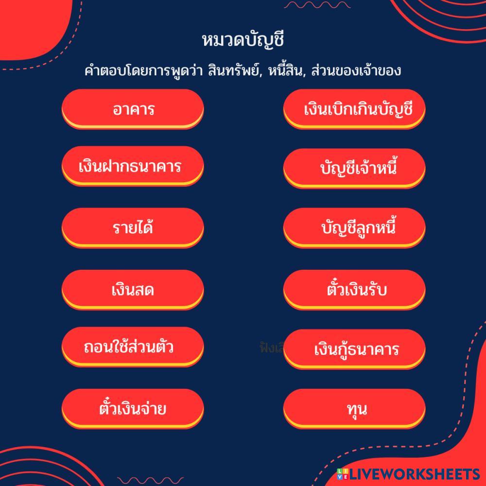 Created byPrapawan bourpet การบัญชีเบื้องต้น การบัญชีเบื้องต้น Age 16+ level: ปวช. Thai Author's Instructions My Google Classroom Courses × 0 classes selected (0 students total) Quick Access Select all classes (0 classes) All Classes Loading courses... Cancel Share Share to selected Course __COURSE_NAME__ __STUDENT_NAME__ (__STUDENT_EMAIL__) ใบงานหมวดบัญชี 2 Download Worksheet Validation Check my answers Emails my answers to my teacher Full name Group/level School subject Teacher's email or key code Close Submit Validating worksheet... (12) Your answers have been sent to your teacher. Good luck! OK We encountered an error submitting your answers. Please try again. OK Advertisement | Go Ad Free Created byPrapawan bourpet การบัญชีเบื้องต้น การบัญชีเบื้องต้น Age 16+ level: ปวช. Thai Author's Instructions