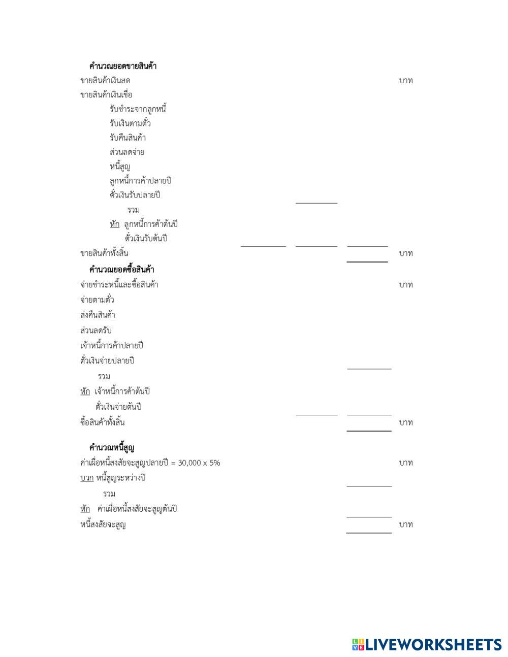 Created byTassanawan Namsing การบัญชีเดี่ยวและการกระทบยอด หน่วยที่6 วิชาการบัญชีเดี่ยวและการกระทบยอด Age 15+ level: ปวช.1 Thai Author's Instructions My Google Classroom Courses × 0 classes selected (0 students total) Quick Access Select all classes (0 classes) All Classes Loading courses... Cancel Share Share to selected Course __COURSE_NAME__ __STUDENT_NAME__ (__STUDENT_EMAIL__) ใบงานการบัญชีเดี่ยวฯ Download Worksheet Validation Check my answers Emails my answers to my teacher Full name Group/level School subject Teacher's email or key code Close Submit Validating worksheet... (12) Your answers have been sent to your teacher. Good luck! OK We encountered an error submitting your answers. Please try again. OK Advertisement | Go Ad Free Created byTassanawan Namsing การบัญชีเดี่ยวและการกระทบยอด หน่วยที่6 วิชาการบัญชีเดี่ยวและการกระทบยอด Age 15+ level: ปวช.1 Thai Author's Instructions