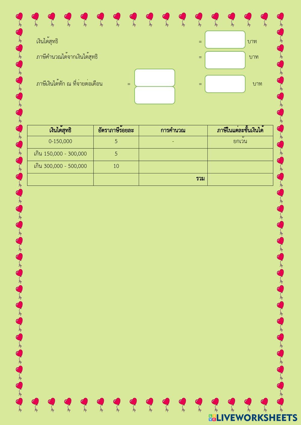 Created byTassanawan Namsing การบัญชีอุตสาหกรรม การบัญชีอุตสาหกรรม Age 15+ level: ปวช.3 Thai Author's Instructions My Google Classroom Courses × 0 classes selected (0 students total) Quick Access Select all classes (0 classes) All Classes Loading courses... Cancel Share Share to selected Course __COURSE_NAME__ __STUDENT_NAME__ (__STUDENT_EMAIL__) ค่าแรง เงินประกันสังคม ภาษีเงินได้หัก ณ ที่จ่าย Download Worksheet Validation Check my answers Emails my answers to my teacher Full name Group/level School subject Teacher's email or key code Close Submit Validating worksheet... (12) Your answers have been sent to your teacher. Good luck! OK We encountered an error submitting your answers. Please try again. OK Advertisement | Go Ad Free Created byTassanawan Namsing การบัญชีอุตสาหกรรม การบัญชีอุตสาหกรรม Age 15+ level: ปวช.3 Thai Author's Instructions