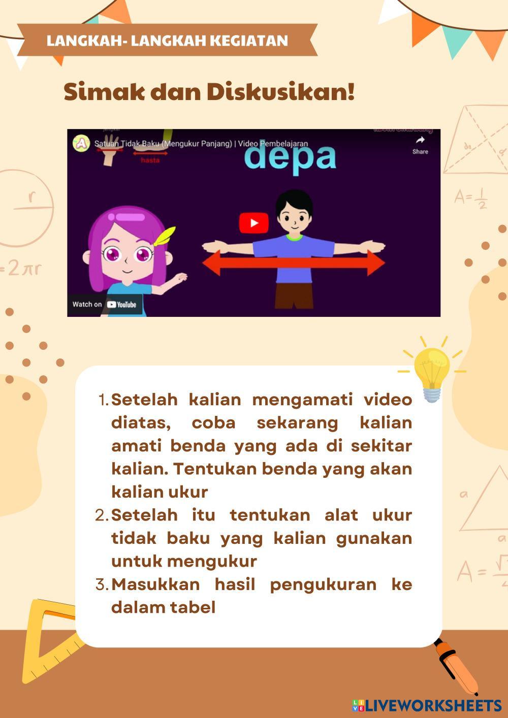 Created byLaura Amalia Matematika Sd Age 8-12 level: 2grade Indonesian Author's Instructions My Google Classroom Courses × 0 classes selected (0 students total) Quick Access Select all classes (0 classes) All Classes Loading courses... Cancel Share Share to selected Course __COURSE_NAME__ __STUDENT_NAME__ (__STUDENT_EMAIL__) LKPD Satuan Tidak Baku Download Worksheet Validation Check my answers Emails my answers to my teacher Full name Group/level School subject Teacher's email or key code Close Submit Validating worksheet... (12) Your answers have been sent to your teacher. Good luck! OK We encountered an error submitting your answers. Please try again. OK Advertisement | Go Ad Free Created byLaura Amalia Matematika Sd Age 8-12 level: 2grade Indonesian Author's Instructions
