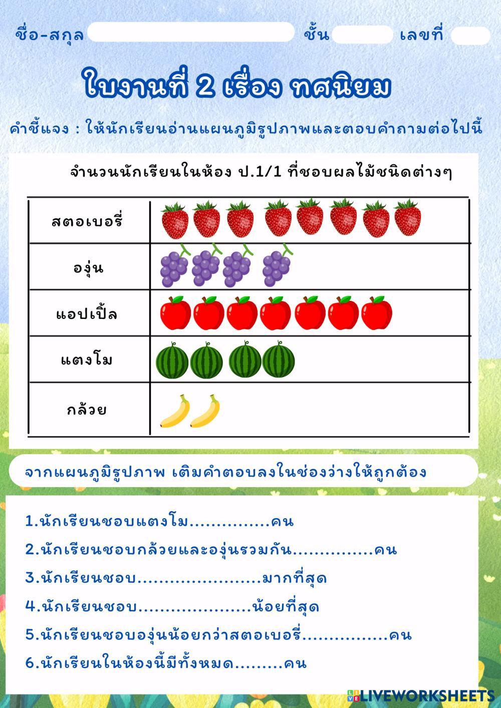 Created by aumaphonpn math Reading picture charts Age 7-12 level: 1 Thai Author's Instructions My Google Classroom Courses × 0 classes selected (0 students total) Quick Access Select all classes (0 classes) All Classes Loading courses... Cancel Share Share to selected Course __COURSE_NAME__ __STUDENT_NAME__ (__STUDENT_EMAIL__) เติมคำตอบ Download Worksheet Validation Check my answers Emails my answers to my teacher Full name Group/level School subject Teacher's email or key code Close Submit Validating worksheet... (12) Your answers have been sent to your teacher. Good luck! OK We encountered an error submitting your answers. Please try again. OK Advertisement | Go Ad Free Created by aumaphonpn math Reading picture charts Age 7-12 level: 1 Thai Author's Instructions