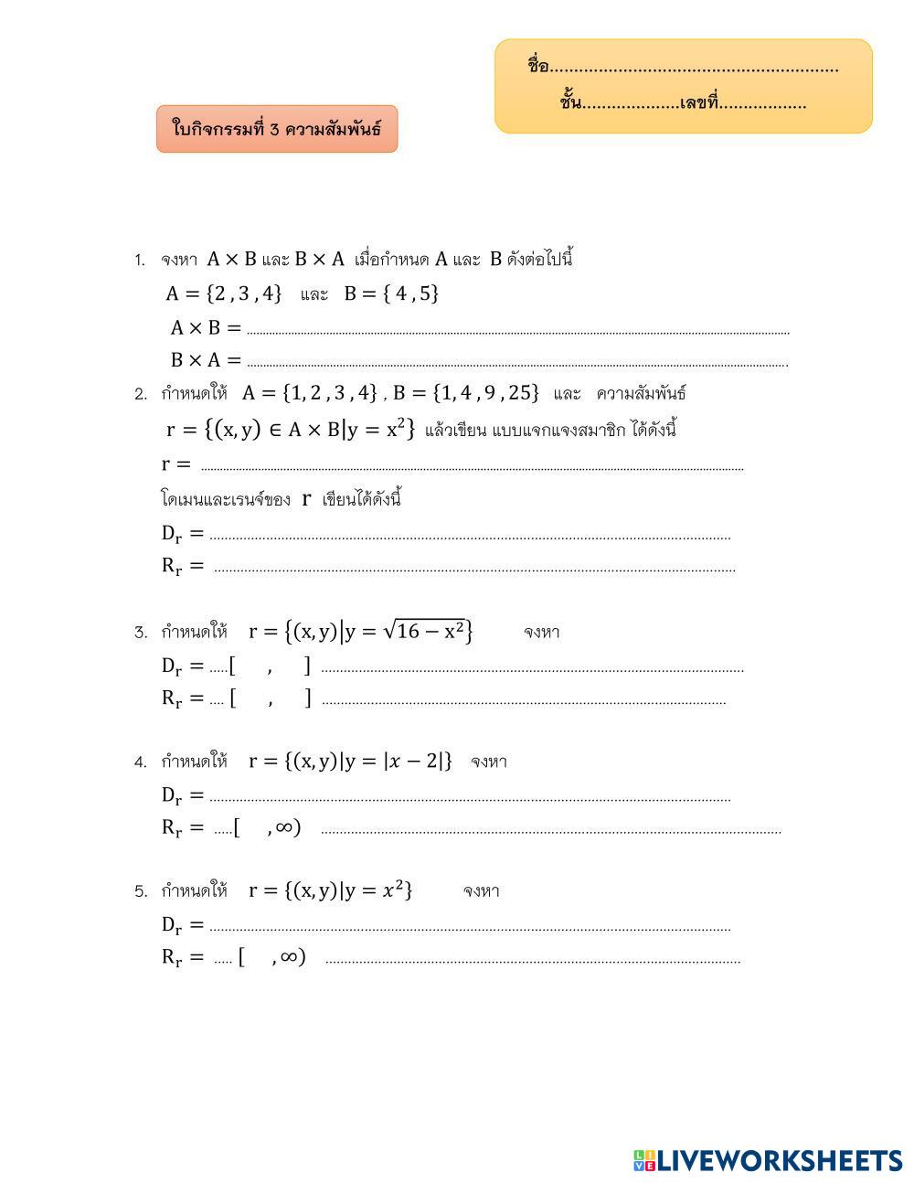 Created by tanyarat25 Mathematics 31201 Mathematics 31201 function Age 15+ level: ม.4 Thai Author's Instructions a My Google Classroom Courses × 0 classes selected (0 students total) Quick Access Select all classes (0 classes) All Classes Loading courses... Cancel Share Share to selected Course __COURSE_NAME__ __STUDENT_NAME__ (__STUDENT_EMAIL__) โดเมน เรนจ์ ความสัมพันธ์ Download Worksheet Validation Check my answers Emails my answers to my teacher Full name Group/level School subject Teacher's email or key code Close Submit Validating worksheet... (12) Your answers have been sent to your teacher. Good luck! OK We encountered an error submitting your answers. Please try again. OK Advertisement | Go Ad Free Created by tanyarat25 Mathematics 31201 Mathematics 31201 function Age 15+ level: ม.4 Thai Author's Instructions a