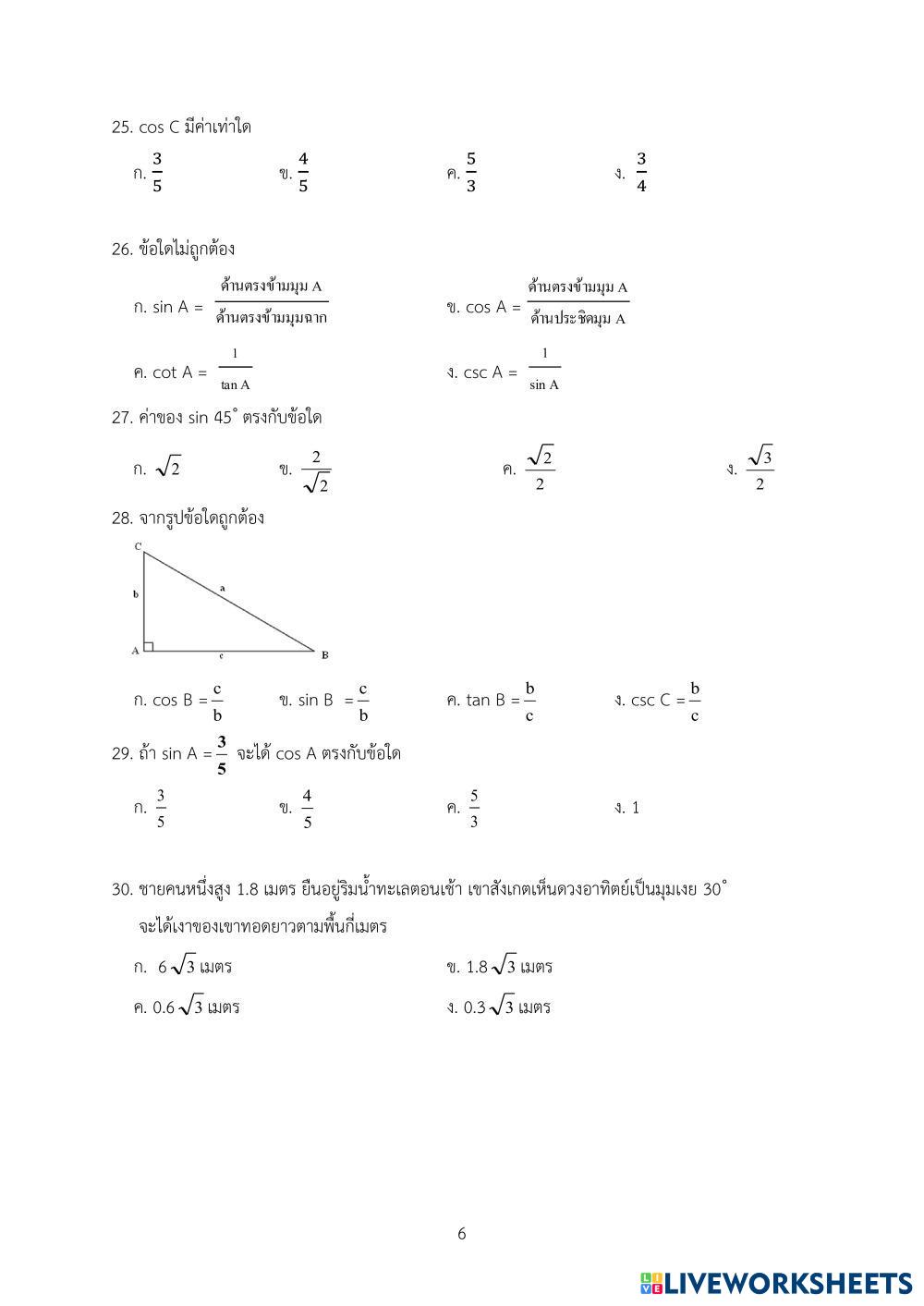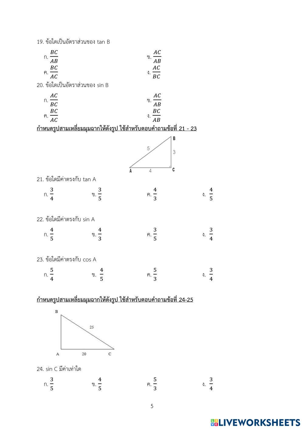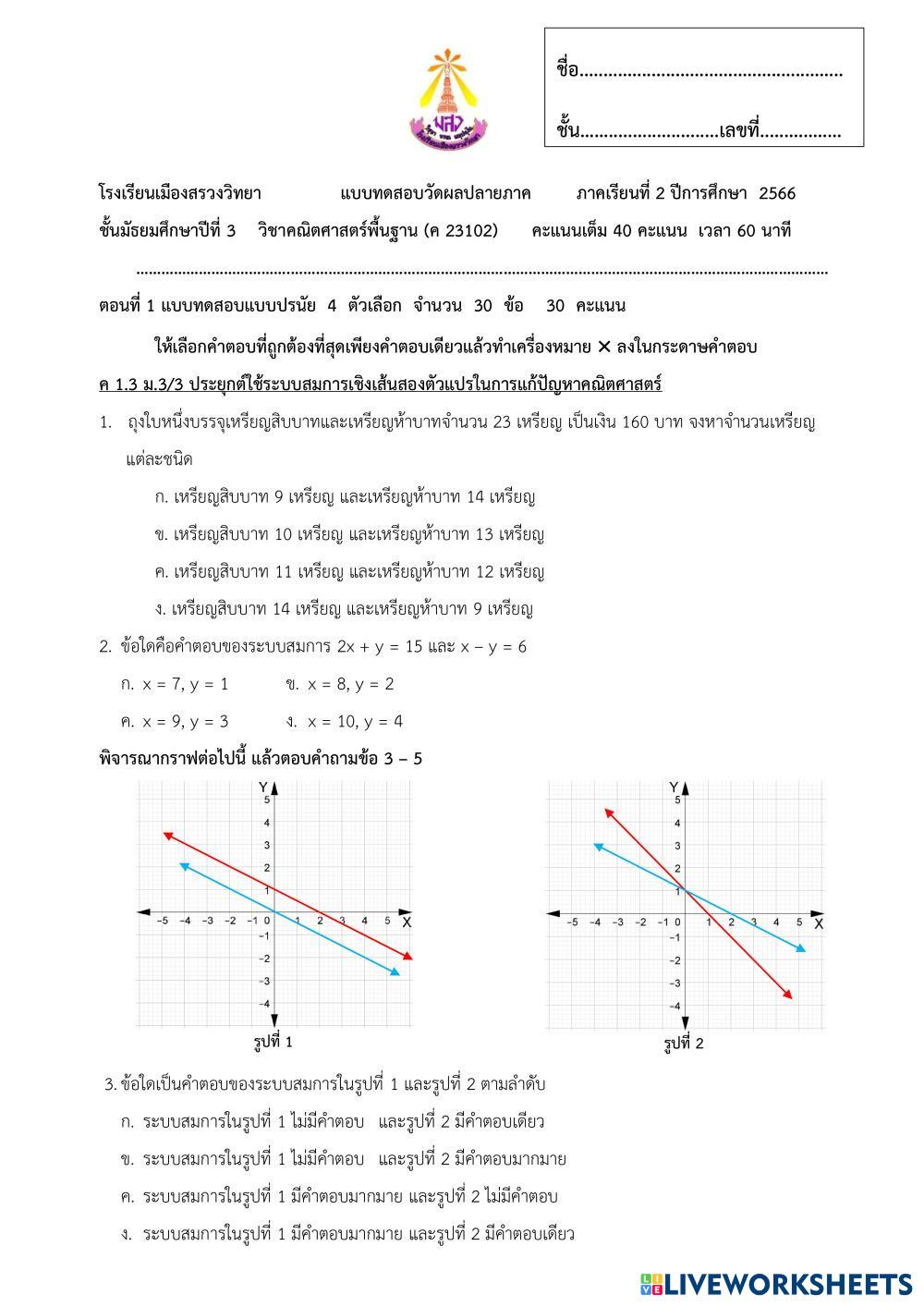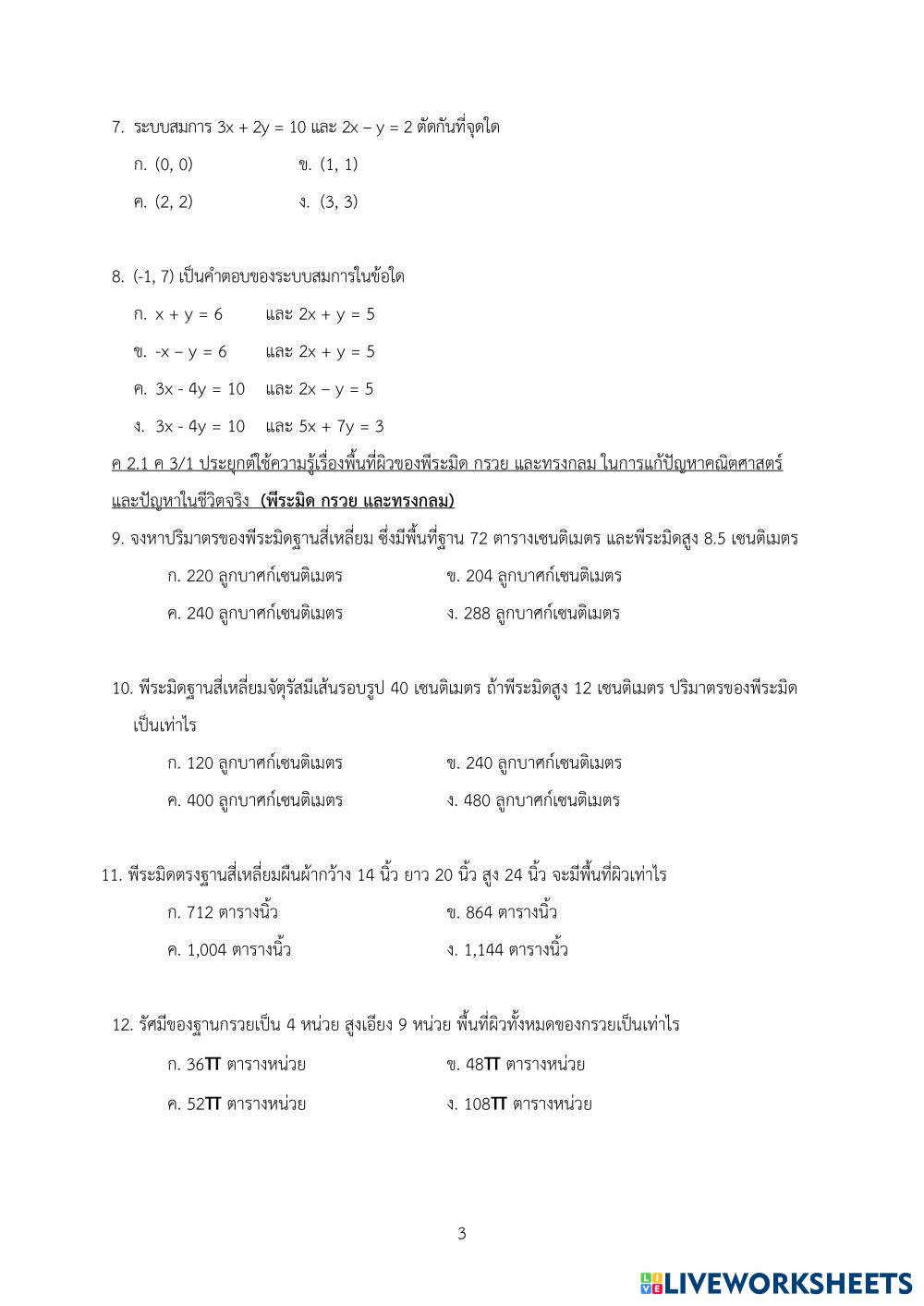 Created byนิตญา ราโช Mathematics pythagorus Age 14+ level: ม.3 Thai Author's Instructions My Google Classroom Courses × 0 classes selected (0 students total) Quick Access Select all classes (0 classes) All Classes Loading courses... Cancel Share Share to selected Course __COURSE_NAME__ __STUDENT_NAME__ (__STUDENT_EMAIL__) แบบทดสอบวัดผลปลายภาค วิชาคณิตศาสตร์พื้นฐาน ค23102 Download Worksheet Validation Check my answers Emails my answers to my teacher Full name Group/level School subject Teacher's email or key code Close Submit Validating worksheet... (12) Your answers have been sent to your teacher. Good luck! OK We encountered an error submitting your answers. Please try again. OK Advertisement | Go Ad Free Created byนิตญา ราโช Mathematics pythagorus Age 14+ level: ม.3 Thai Author's Instructions