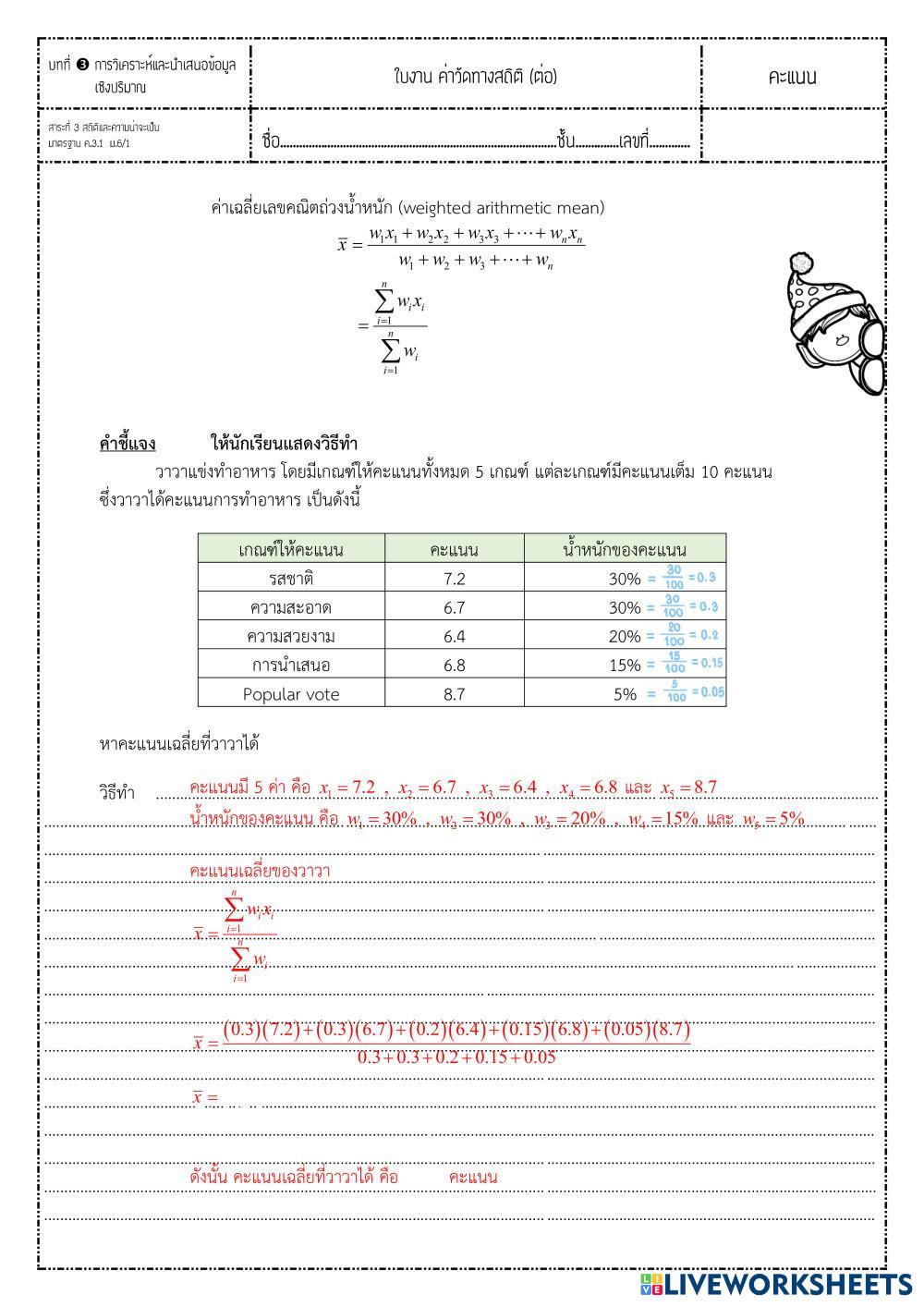 Created by bbeesirilak mathematics statistic Age 16+ level: Grade 12 Thai Author's Instructions My Google Classroom Courses × 0 classes selected (0 students total) Quick Access Select all classes (0 classes) All Classes Loading courses... Cancel Share Share to selected Course __COURSE_NAME__ __STUDENT_NAME__ (__STUDENT_EMAIL__) ใบงาน ค่าเฉลี่ยเลขคณิตและค่าเฉลี่ย Download Worksheet Validation Check my answers Emails my answers to my teacher Full name Group/level School subject Teacher's email or key code Close Submit Validating worksheet... (12) Your answers have been sent to your teacher. Good luck! OK We encountered an error submitting your answers. Please try again. OK Advertisement | Go Ad Free Created by bbeesirilak mathematics statistic Age 16+ level: Grade 12 Thai Author's Instructions