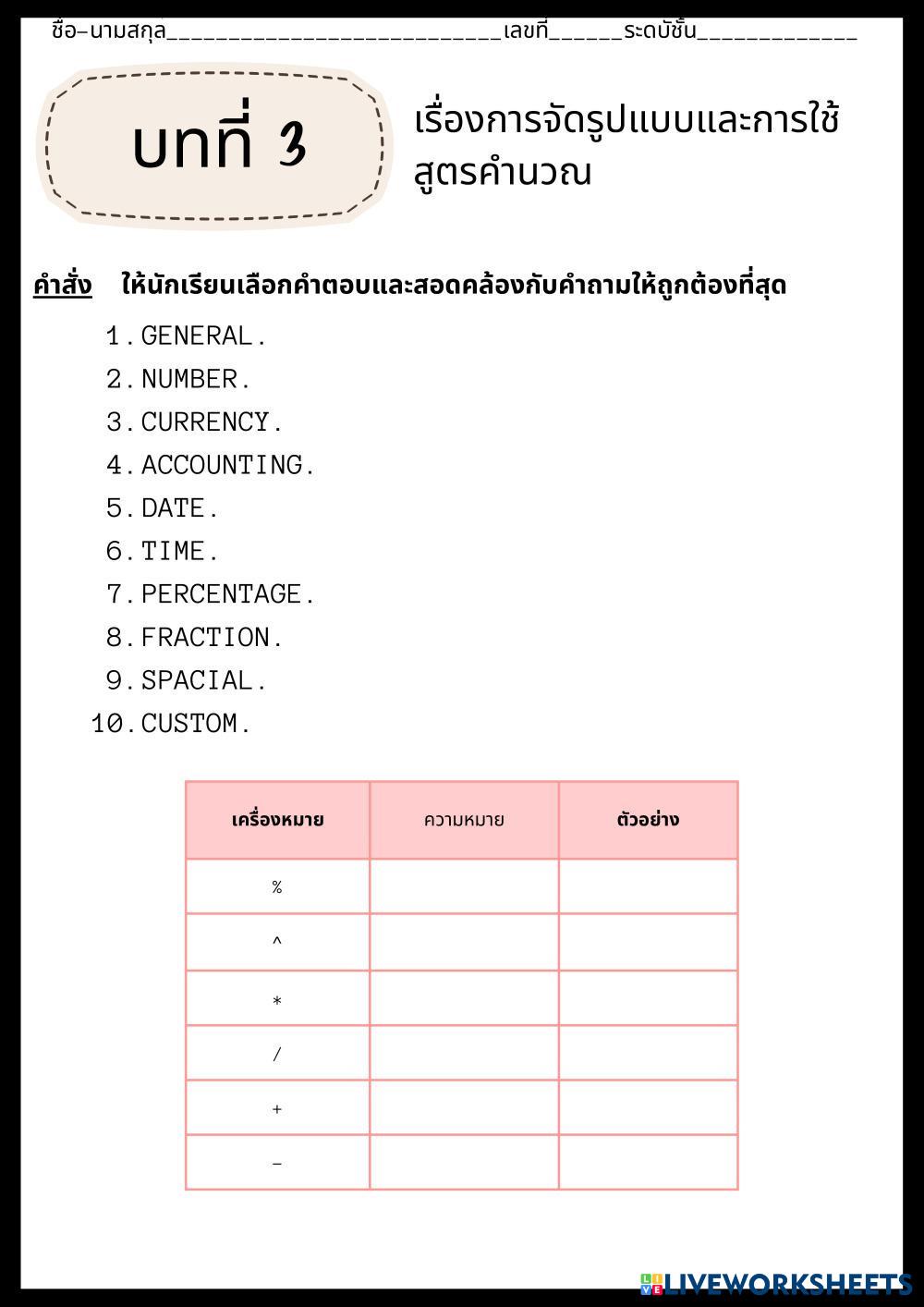 Created bysiriporn phetklieang งานบัญชี 2 การจัดรูปแบบและการใช้สูตรคำนวณ Age 17+ level: 10 Thai Author's Instructions My Google Classroom Courses × 0 classes selected (0 students total) Quick Access Select all classes (0 classes) All Classes Loading courses... Cancel Share Share to selected Course __COURSE_NAME__ __STUDENT_NAME__ (__STUDENT_EMAIL__) การจัดรูปแบบและการใช้สูตรการคำนวณ Download Worksheet Validation Check my answers Emails my answers to my teacher Full name Group/level School subject Teacher's email or key code Close Submit Validating worksheet... (12) Your answers have been sent to your teacher. Good luck! OK We encountered an error submitting your answers. Please try again. OK Advertisement | Go Ad Free Created bysiriporn phetklieang งานบัญชี 2 การจัดรูปแบบและการใช้สูตรคำนวณ Age 17+ level: 10 Thai Author's Instructions