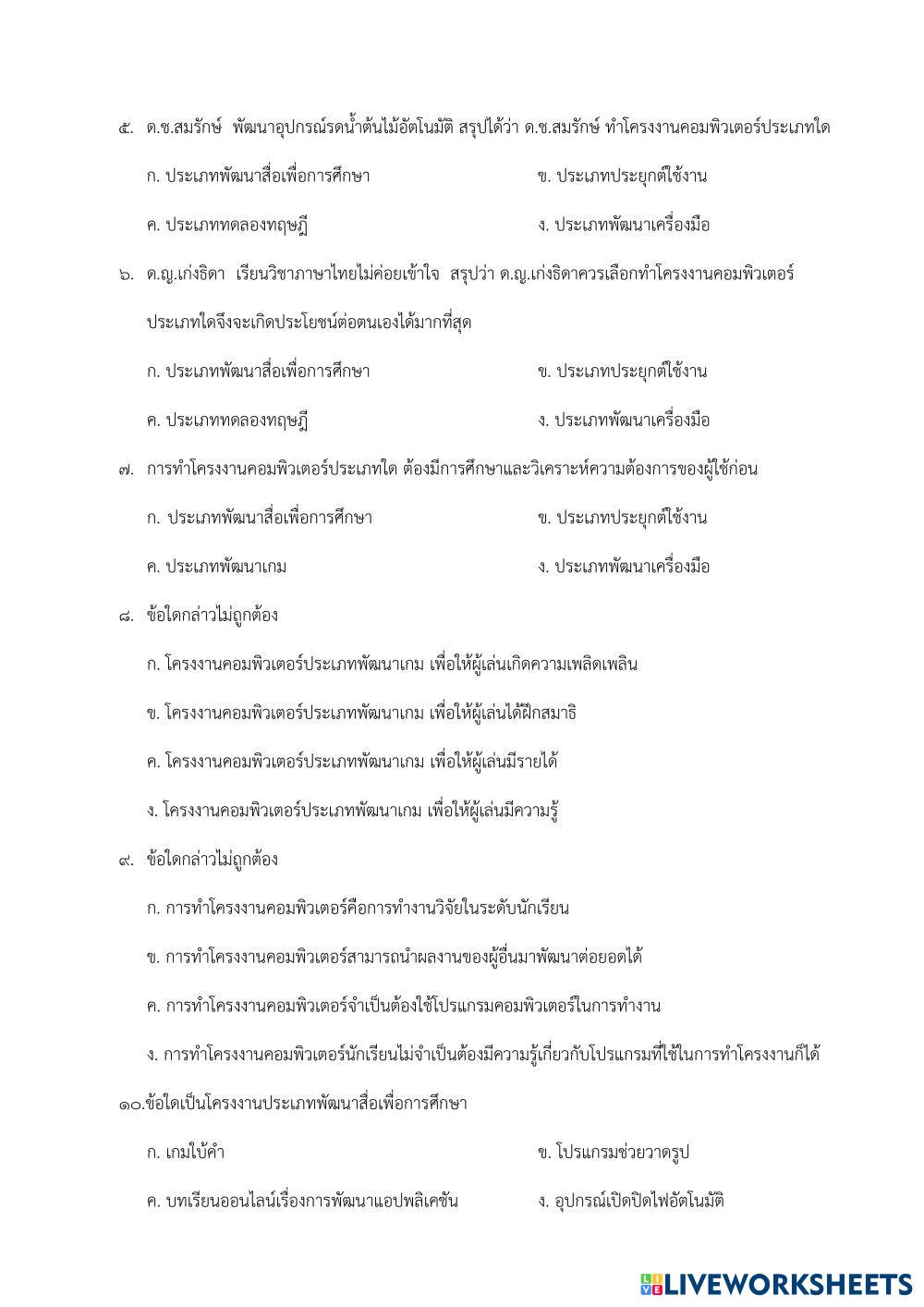 Created bypongsri samsrithong โครงงานคอมพิวเตอร์ ความหมาย คุณค่าและความสำคัญ และประเภทของโครงงานคอมพิวเตอร์ Age 14-16 level: 9 Thai Author's Instructions My Google Classroom Courses × 0 classes selected (0 students total) Quick Access Select all classes (0 classes) All Classes Loading courses... Cancel Share Share to selected Course __COURSE_NAME__ __STUDENT_NAME__ (__STUDENT_EMAIL__) แบบทดสอบโครงงานคอมพิวเตอร์ชุดที่ ๑ Download Worksheet Validation Check my answers Emails my answers to my teacher Full name Group/level School subject Teacher's email or key code Close Submit Validating worksheet... (12) Your answers have been sent to your teacher. Good luck! OK We encountered an error submitting your answers. Please try again. OK Advertisement | Go Ad Free Created bypongsri samsrithong โครงงานคอมพิวเตอร์ ความหมาย คุณค่าและความสำคัญ และประเภทของโครงงานคอมพิวเตอร์ Age 14-16 level: 9 Thai Author's Instructions