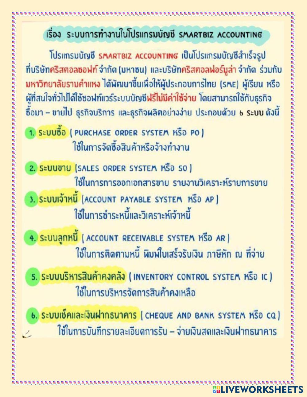 Created byTassanawan Namsing โปรแกรมสำเร็จรูปเพื่องานบัญชี โปรแกรมสำเร็จรูปเพื่องานบัญชี Age 15+ level: ปวส.1 Thai Author's Instructions My Google Classroom Courses × 0 classes selected (0 students total) Quick Access Select all classes (0 classes) All Classes Loading courses... Cancel Share Share to selected Course __COURSE_NAME__ __STUDENT_NAME__ (__STUDENT_EMAIL__) ใบงานที่ 3 Download Worksheet Validation Check my answers Emails my answers to my teacher Full name Group/level School subject Teacher's email or key code Close Submit Validating worksheet... (12) Your answers have been sent to your teacher. Good luck! OK We encountered an error submitting your answers. Please try again. OK Advertisement | Go Ad Free Created byTassanawan Namsing โปรแกรมสำเร็จรูปเพื่องานบัญชี โปรแกรมสำเร็จรูปเพื่องานบัญชี Age 15+ level: ปวส.1 Thai Author's Instructions
