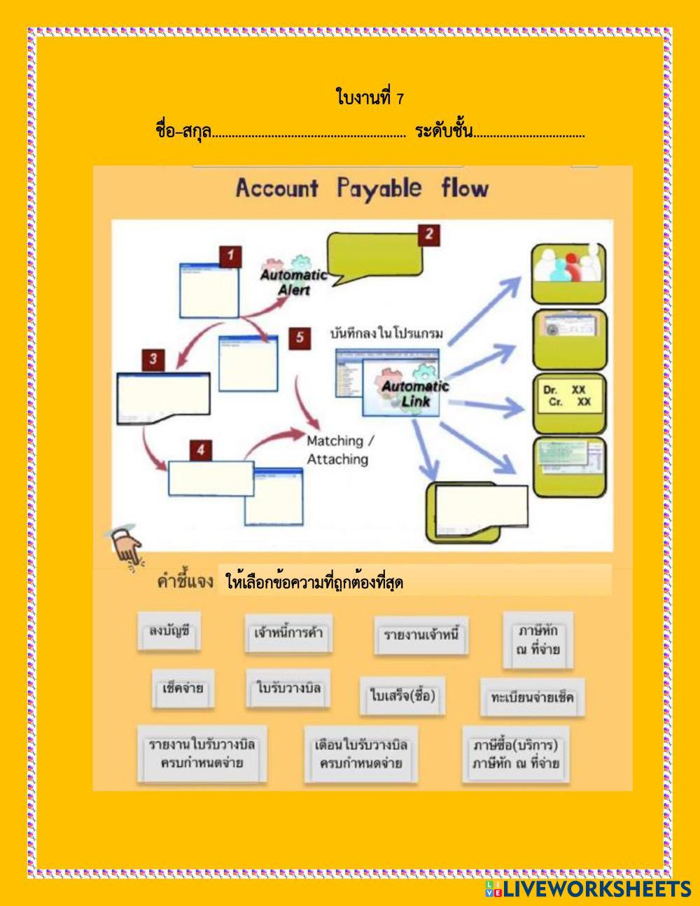 Created byTassanawan Namsing โปรแกรมสำเร็จรูปเพื่องานบัญชี โปรแกรมสำเร็จรูปเพื่องานบัญชี Age 15+ level: ปวส.1 Thai Author's Instructions My Google Classroom Courses × 0 classes selected (0 students total) Quick Access Select all classes (0 classes) All Classes Loading courses... Cancel Share Share to selected Course __COURSE_NAME__ __STUDENT_NAME__ (__STUDENT_EMAIL__) ใบงานที่ 7 Download Worksheet Validation Check my answers Emails my answers to my teacher Full name Group/level School subject Teacher's email or key code Close Submit Validating worksheet... (12) Your answers have been sent to your teacher. Good luck! OK We encountered an error submitting your answers. Please try again. OK Advertisement | Go Ad Free Created byTassanawan Namsing โปรแกรมสำเร็จรูปเพื่องานบัญชี โปรแกรมสำเร็จรูปเพื่องานบัญชี Age 15+ level: ปวส.1 Thai Author's Instructions