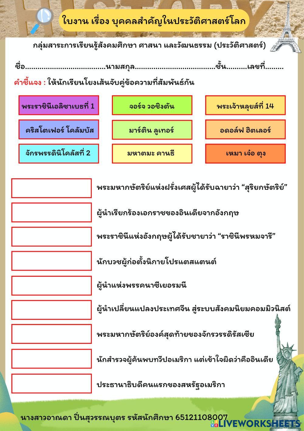 Created byArnada Pinsuwanboot ประวัติศาสตร์สากล ประวัติศาสตร์สากล Age 14+ level: ม.4 - 6 Thai Author's Instructions My Google Classroom Courses × 0 classes selected (0 students total) Quick Access Select all classes (0 classes) All Classes Loading courses... Cancel Share Share to selected Course __COURSE_NAME__ __STUDENT_NAME__ (__STUDENT_EMAIL__) ใบงานบุคคลสำคัญในประวัติศาสตร์โลก Download Worksheet Validation Check my answers Emails my answers to my teacher Full name Group/level School subject Teacher's email or key code Close Submit Validating worksheet... (12) Your answers have been sent to your teacher. Good luck! OK We encountered an error submitting your answers. Please try again. OK Advertisement | Go Ad Free Created byArnada Pinsuwanboot ประวัติศาสตร์สากล ประวัติศาสตร์สากล Age 14+ level: ม.4 - 6 Thai Author's Instructions