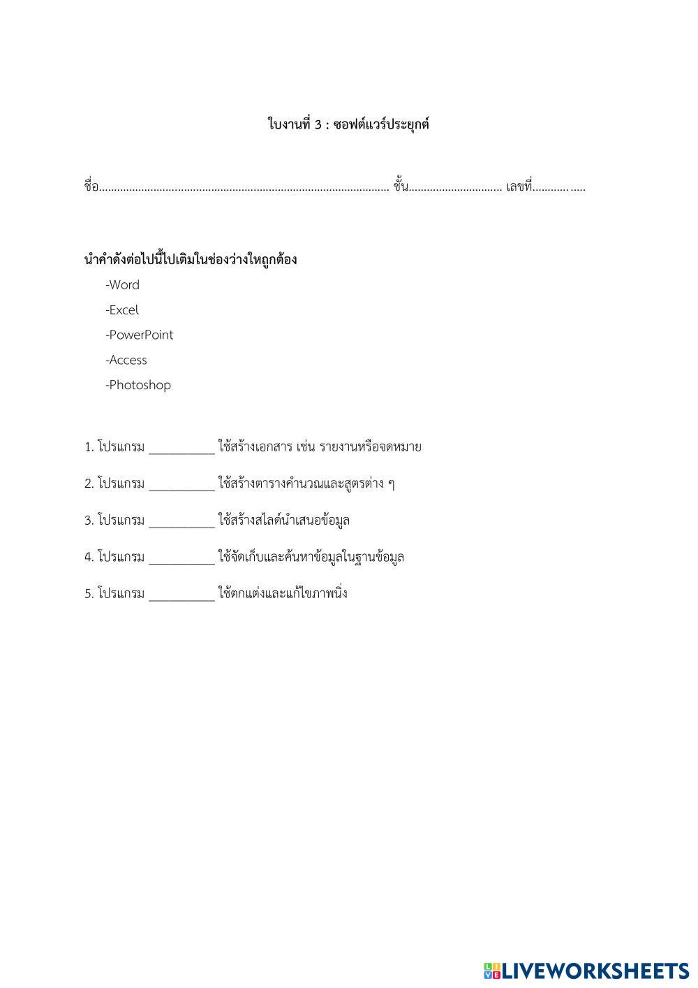 Created by 0615 Science Middle School 8th grade Earth Science Thai Author's Instructions . My Google Classroom Courses × 0 classes selected (0 students total) Quick Access Select all classes (0 classes) All Classes Loading courses... Cancel Share Share to selected Course __COURSE_NAME__ __STUDENT_NAME__ (__STUDENT_EMAIL__) ซอฟต์แวร์ประยุกต์ Download Worksheet Validation Check my answers Emails my answers to my teacher Full name Group/level School subject Teacher's email or key code Close Submit Validating worksheet... (12) Your answers have been sent to your teacher. Good luck! OK We encountered an error submitting your answers. Please try again. OK Advertisement | Go Ad Free Created by 0615 Science Middle School 8th grade Earth Science Thai Author's Instructions . Explore Worksheets Indie Science 8th grade Indie Earth Science - Science Dopasuj 11 opisów tradycyjnych przedmiotów lub elementów z kultury indyjskiej do odpowiednich obrazków. LKPD DIHIBRIDA LEVEL A - ANALISIS BALIK Science 8th grade LKPD DIHIBRIDA LEVEL A - ANALISIS BALIK Earth Science - Science Baca Petunjuk Pengerjaan dan kirim key kode: jsKSDYakNQ ADALAH POKOKNYA Science 8th grade ADALAH POKOKNYA Earth Science - Science ISI AJA EA หลักการทำงานของระบบคอมพิวเตอร์ Science 8th grade หลักการทำงานของระบบคอมพิวเตอร์ Earth Science - Science .
