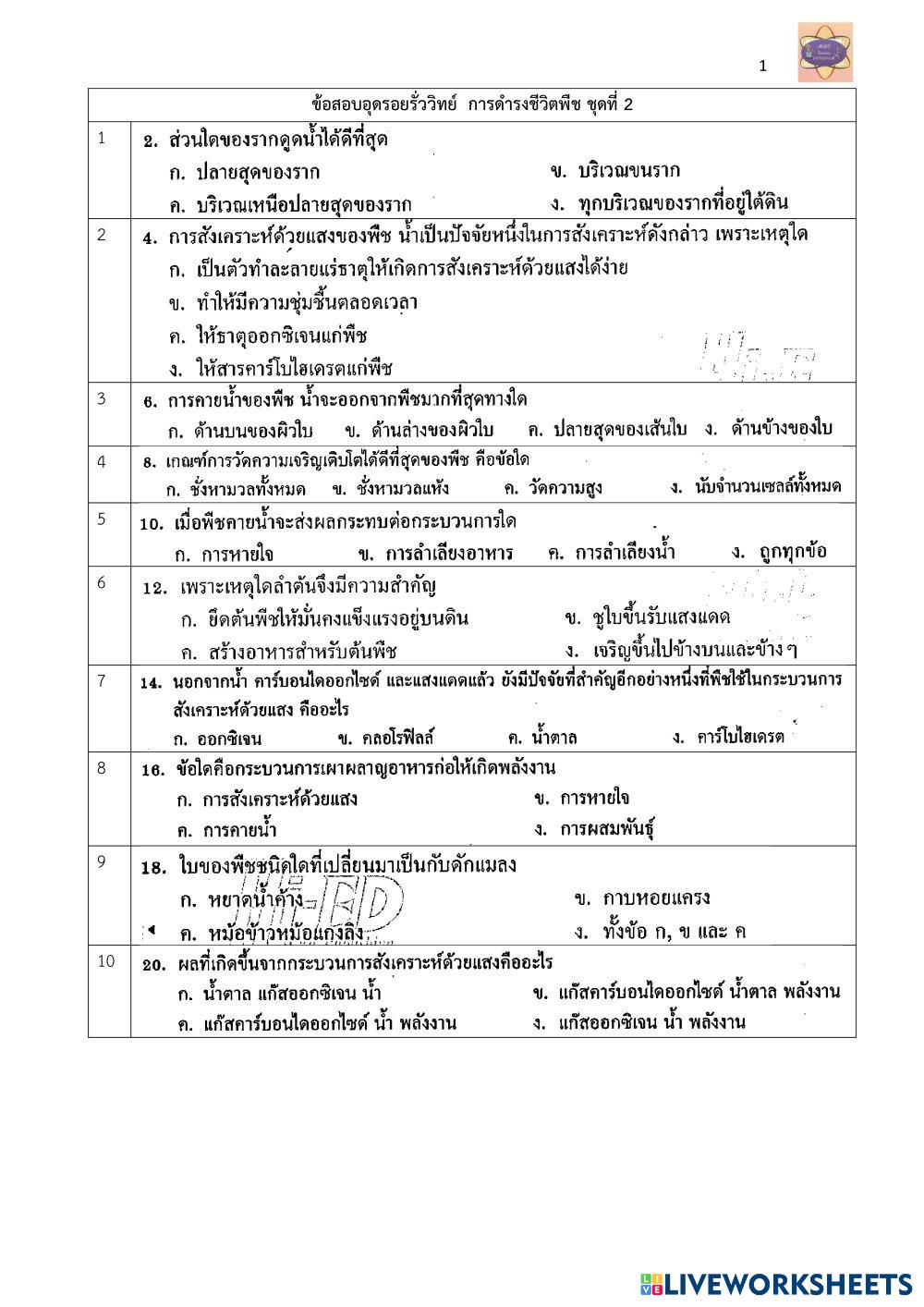 Created by sarisyos science สอบเข้าม.1 Age 12-15 level: ป.6 Thai Author's Instructions My Google Classroom Courses × 0 classes selected (0 students total) Quick Access Select all classes (0 classes) All Classes Loading courses... Cancel Share Share to selected Course __COURSE_NAME__ __STUDENT_NAME__ (__STUDENT_EMAIL__) การดำรงชีวิตพืช 2 Download Worksheet Validation Check my answers Emails my answers to my teacher Full name Group/level School subject Teacher's email or key code Close Submit Validating worksheet... (12) Your answers have been sent to your teacher. Good luck! OK We encountered an error submitting your answers. Please try again. OK Advertisement | Go Ad Free Created by sarisyos science สอบเข้าม.1 Age 12-15 level: ป.6 Thai Author's Instructions