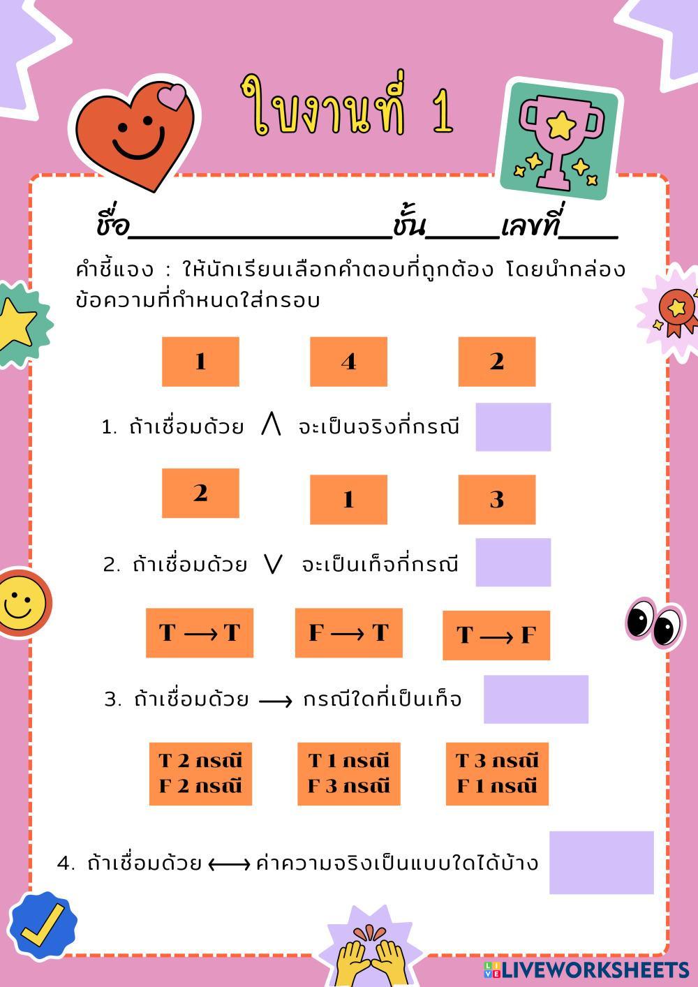 Created bySamsuree chetu ตารางค่าความจริง number(9231000) Age 16+ level: 4 Thai Author's Instructions My Google Classroom Courses × 0 classes selected (0 students total) Quick Access Select all classes (0 classes) All Classes Loading courses... Cancel Share Share to selected Course __COURSE_NAME__ __STUDENT_NAME__ (__STUDENT_EMAIL__) ตารางค่าความจริง Download Worksheet Validation Check my answers Emails my answers to my teacher Full name Group/level School subject Teacher's email or key code Close Submit Validating worksheet... (12) Your answers have been sent to your teacher. Good luck! OK We encountered an error submitting your answers. Please try again. OK Advertisement | Go Ad Free Created bySamsuree chetu ตารางค่าความจริง number(9231000) Age 16+ level: 4 Thai Author's Instructions