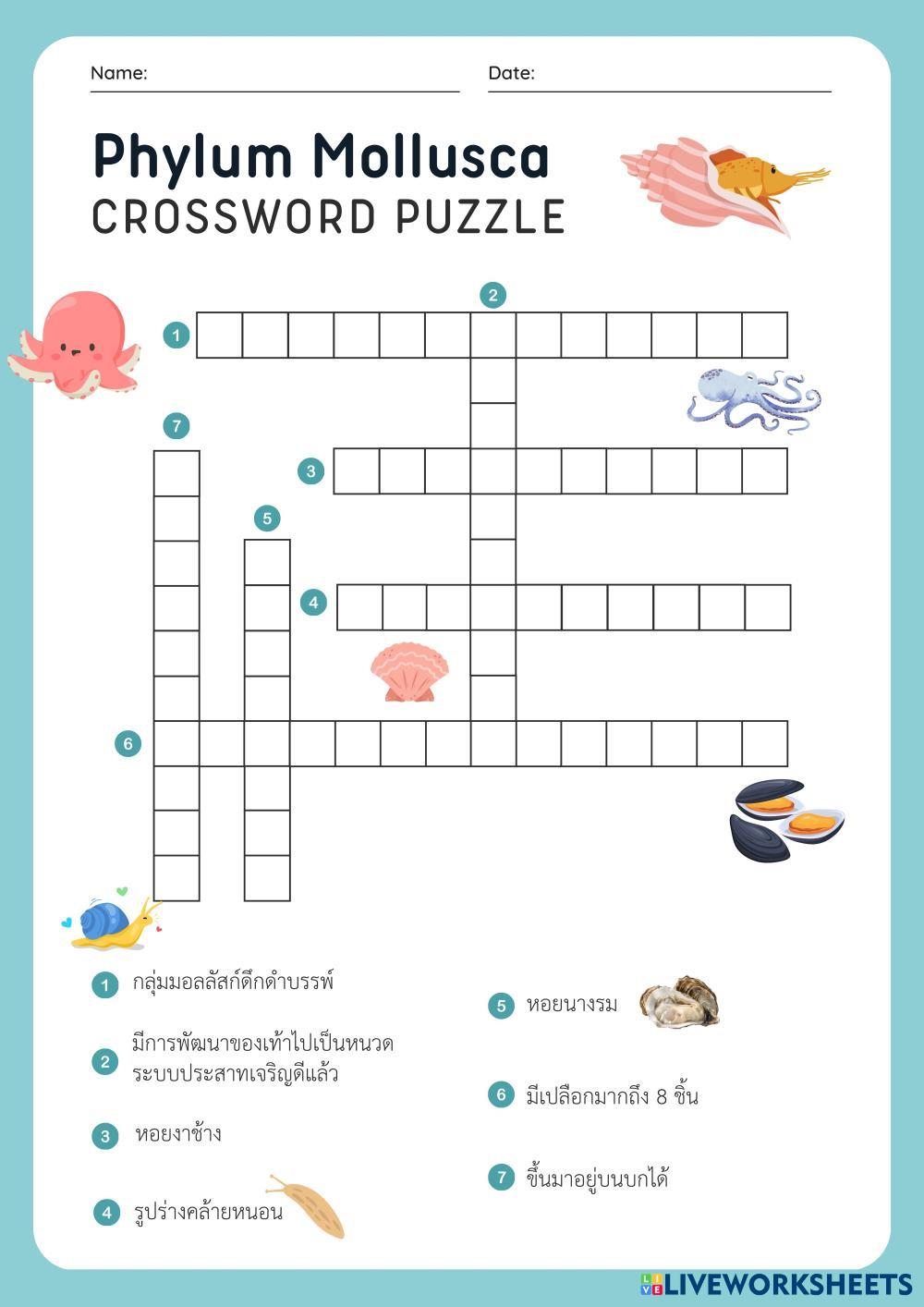 Created byWorakan Lomduangchan Taxonomy Mollusca Age 18+ level: 3 Thai Author's Instructions My Google Classroom Courses × 0 classes selected (0 students total) Quick Access Select all classes (0 classes) All Classes Loading courses... Cancel Share Share to selected Course __COURSE_NAME__ __STUDENT_NAME__ (__STUDENT_EMAIL__) Phylum mollusca crossword Download Worksheet Validation Check my answers Emails my answers to my teacher Full name Group/level School subject Teacher's email or key code Close Submit Validating worksheet... (12) Your answers have been sent to your teacher. Good luck! OK We encountered an error submitting your answers. Please try again. OK Advertisement | Go Ad Free Created byWorakan Lomduangchan Taxonomy Mollusca Age 18+ level: 3 Thai Author's Instructions