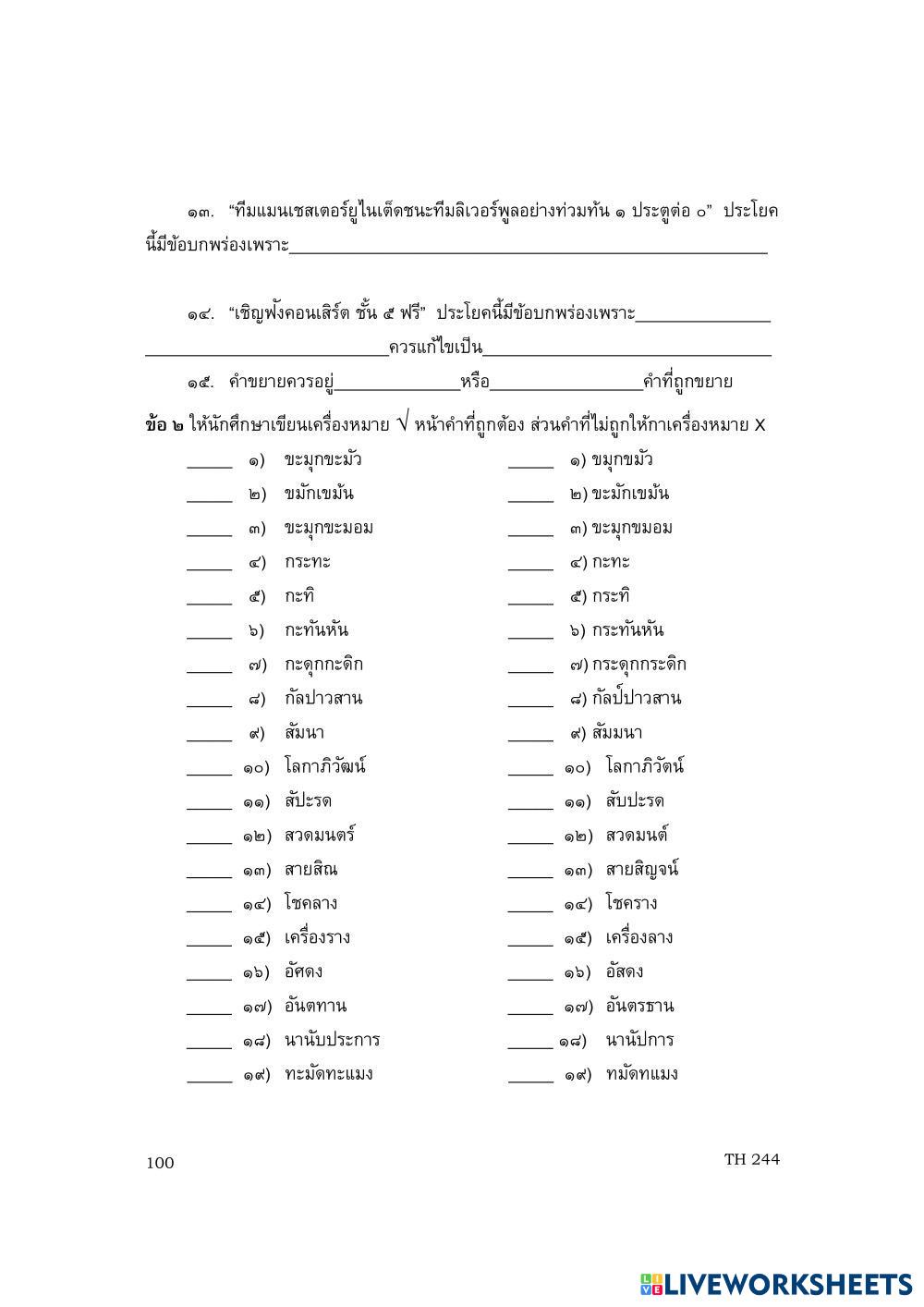 Created byAiwarin Thai Language Thai Language Age 16+ level: 16 Thai Author's Instructions My Google Classroom Courses × 0 classes selected (0 students total) Quick Access Select all classes (0 classes) All Classes Loading courses... Cancel Share Share to selected Course __COURSE_NAME__ __STUDENT_NAME__ (__STUDENT_EMAIL__) ภาษาไทยและขอบกพร่องในการใช้ภาษา Download Worksheet Validation Check my answers Emails my answers to my teacher Full name Group/level School subject Teacher's email or key code Close Submit Validating worksheet... (12) Your answers have been sent to your teacher. Good luck! OK We encountered an error submitting your answers. Please try again. OK Advertisement | Go Ad Free Created byAiwarin Thai Language Thai Language Age 16+ level: 16 Thai Author's Instructions