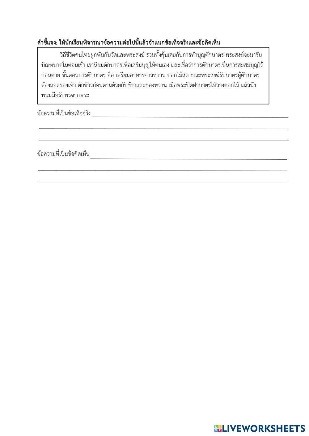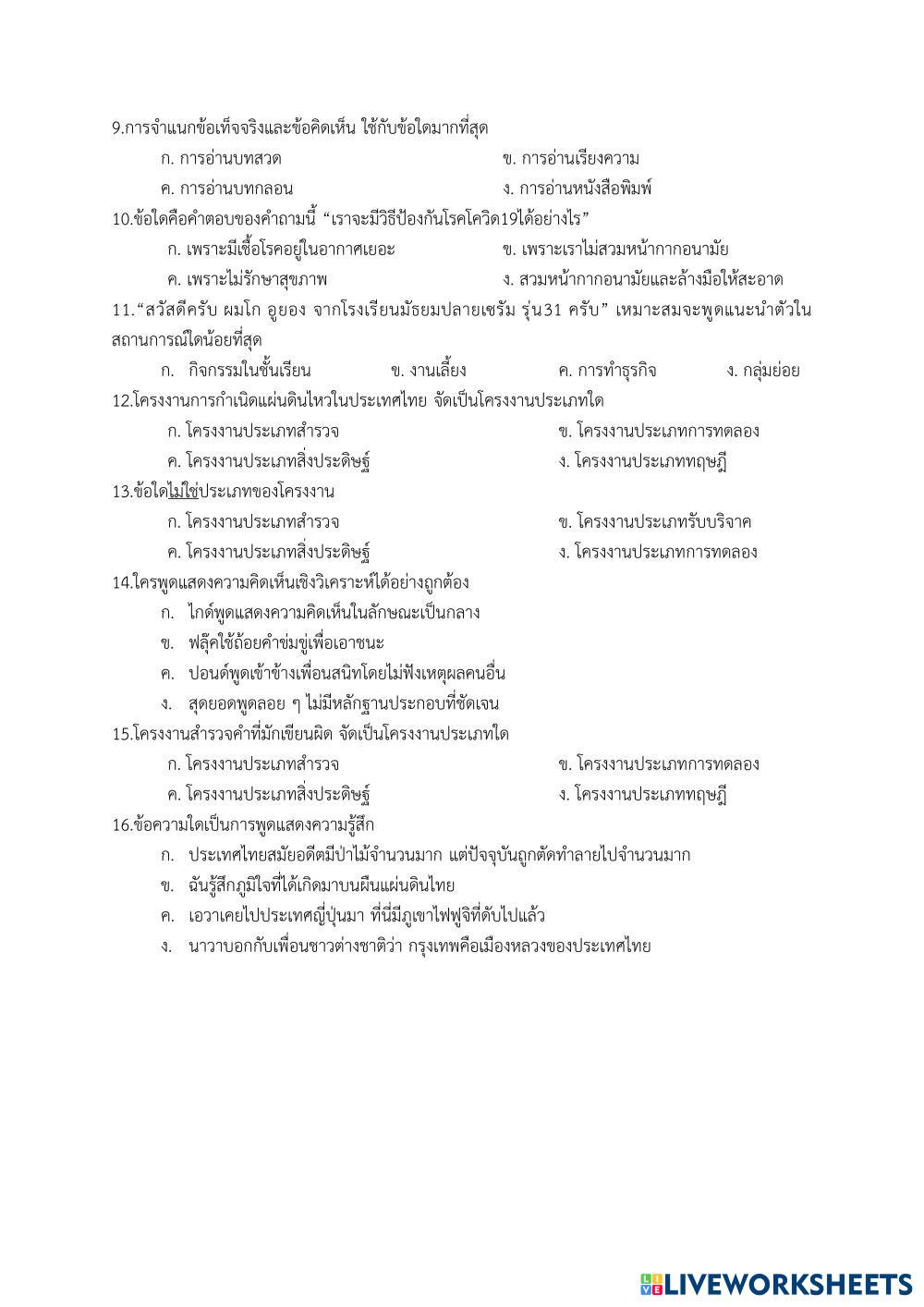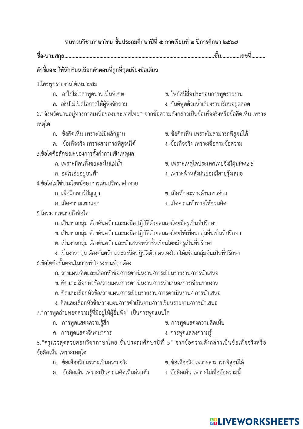 Created byWarunya Cha-aimpong Thai language(22567) Review(22567) Age 10-14 level: ป.5 Thai Author's Instructions My Google Classroom Courses × 0 classes selected (0 students total) Quick Access Select all classes (0 classes) All Classes Loading courses... Cancel Share Share to selected Course __COURSE_NAME__ __STUDENT_NAME__ (__STUDENT_EMAIL__) ทบทวนวิชาภาษาไทย ชั้นประถมศึกษาปีที่ ๕ ภาคเรียนที่ ๒ ปีการศึกษา ๒๕๖๗ Download Worksheet Validation Check my answers Emails my answers to my teacher Full name Group/level School subject Teacher's email or key code Close Submit Validating worksheet... (12) Your answers have been sent to your teacher. Good luck! OK We encountered an error submitting your answers. Please try again. OK Advertisement | Go Ad Free Created byWarunya Cha-aimpong Thai language(22567) Review(22567) Age 10-14 level: ป.5 Thai Author's Instructions