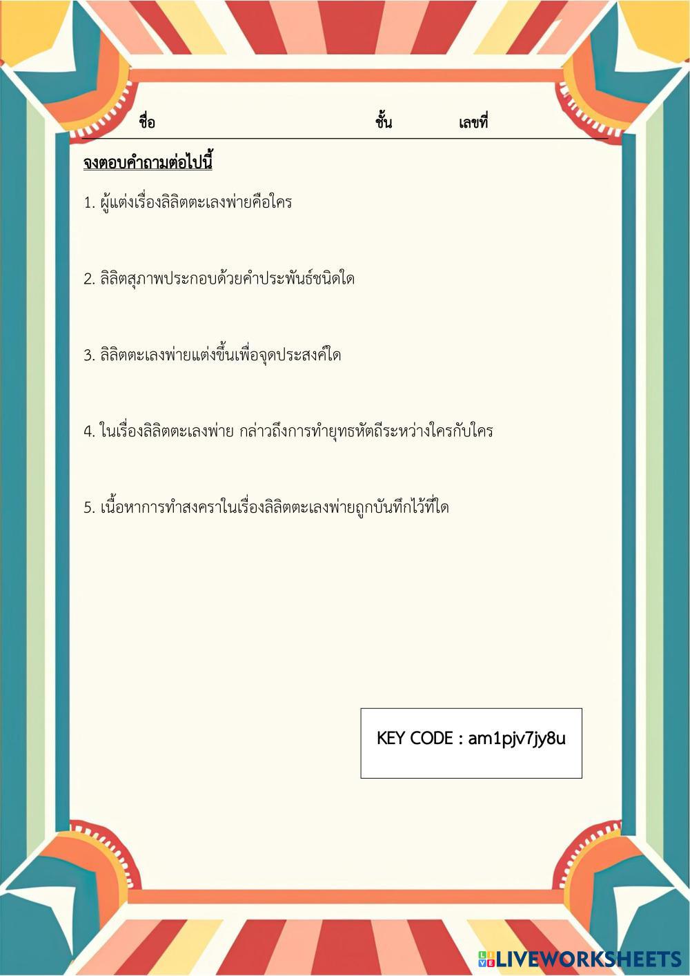 Created by Nantikarn Thai วรรณคดี Age 17+ level: - Thai Author's Instructions My Google Classroom Courses × 0 classes selected (0 students total) Quick Access Select all classes (0 classes) All Classes Loading courses... Cancel Share Share to selected Course __COURSE_NAME__ __STUDENT_NAME__ (__STUDENT_EMAIL__) ลิลิตตะเลงพ่าย Download Worksheet Validation Check my answers Emails my answers to my teacher Full name Group/level School subject Teacher's email or key code Close Submit Validating worksheet... (12) Your answers have been sent to your teacher. Good luck! OK We encountered an error submitting your answers. Please try again. OK Advertisement | Go Ad Free Created by Nantikarn Thai วรรณคดี Age 17+ level: - Thai Author's Instructions