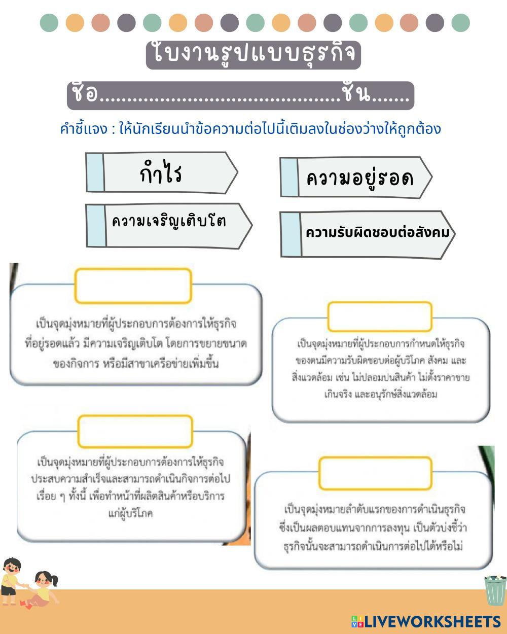 Created byTassanawan Namsing ธุรกิจเบื้องต้น ธุรกิจเบื้องต้น Age 11+ level: ม.3 Thai Author's Instructions My Google Classroom Courses × 0 classes selected (0 students total) Quick Access Select all classes (0 classes) All Classes Loading courses... Cancel Share Share to selected Course __COURSE_NAME__ __STUDENT_NAME__ (__STUDENT_EMAIL__) ใบงานรูปแบบธุรกิจ Download Worksheet Validation Check my answers Emails my answers to my teacher Full name Group/level School subject Teacher's email or key code Close Submit Validating worksheet... (12) Your answers have been sent to your teacher. Good luck! OK We encountered an error submitting your answers. Please try again. OK Advertisement | Go Ad Free Created byTassanawan Namsing ธุรกิจเบื้องต้น ธุรกิจเบื้องต้น Age 11+ level: ม.3 Thai Author's Instructions