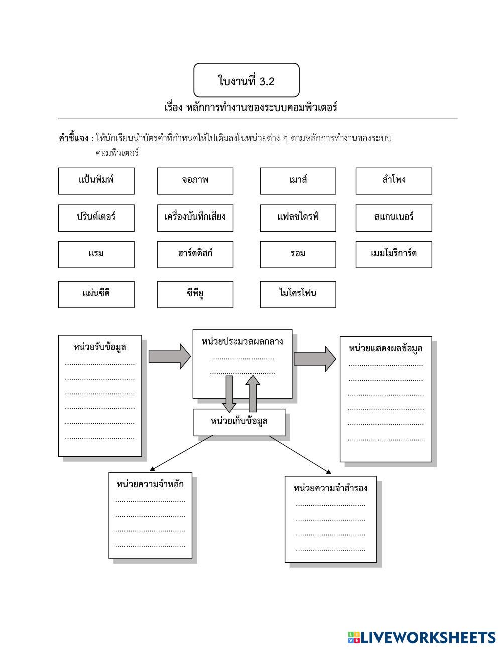 Created bySUWIMON วิทยาการคำนวณ หลักการทำงานคอมพิวเตอร์ Age 13-17 level: ม.2 Thai Author's Instructions My Google Classroom Courses × 0 classes selected (0 students total) Quick Access Select all classes (0 classes) All Classes Loading courses... Cancel Share Share to selected Course __COURSE_NAME__ __STUDENT_NAME__ (__STUDENT_EMAIL__) ครูสุวิมล ด้วงยศ Download Worksheet Validation Check my answers Emails my answers to my teacher Full name Group/level School subject Teacher's email or key code Close Submit Validating worksheet... (12) Your answers have been sent to your teacher. Good luck! OK We encountered an error submitting your answers. Please try again. OK Advertisement | Go Ad Free Created bySUWIMON วิทยาการคำนวณ หลักการทำงานคอมพิวเตอร์ Age 13-17 level: ม.2 Thai Author's Instructions