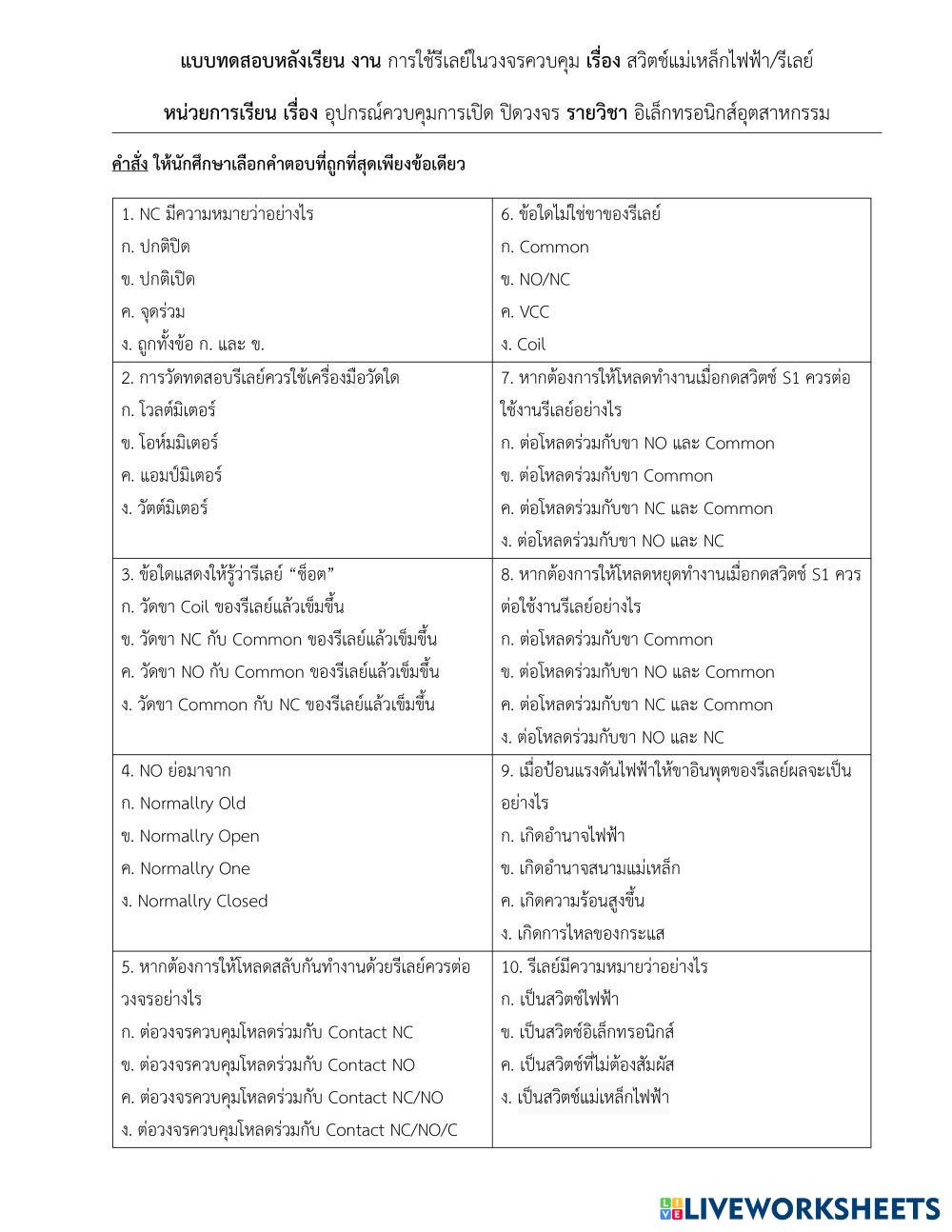 Created by arunchumard อิเล็กทรอนิกส์อุตสาหกรรม รีเลย์ Age 12+ level: ปวช.3 Thai Author's Instructions My Google Classroom Courses × 0 classes selected (0 students total) Quick Access Select all classes (0 classes) All Classes Loading courses... Cancel Share Share to selected Course __COURSE_NAME__ __STUDENT_NAME__ (__STUDENT_EMAIL__) แบบทดสอบหลังเรียน เรื่อง การใช้รีเลย์ในวงจรควบคุม Download Worksheet Validation Check my answers Emails my answers to my teacher Full name Group/level School subject Teacher's email or key code Close Submit Validating worksheet... (12) Your answers have been sent to your teacher. Good luck! OK We encountered an error submitting your answers. Please try again. OK Advertisement | Go Ad Free Created by arunchumard อิเล็กทรอนิกส์อุตสาหกรรม รีเลย์ Age 12+ level: ปวช.3 Thai Author's Instructions
