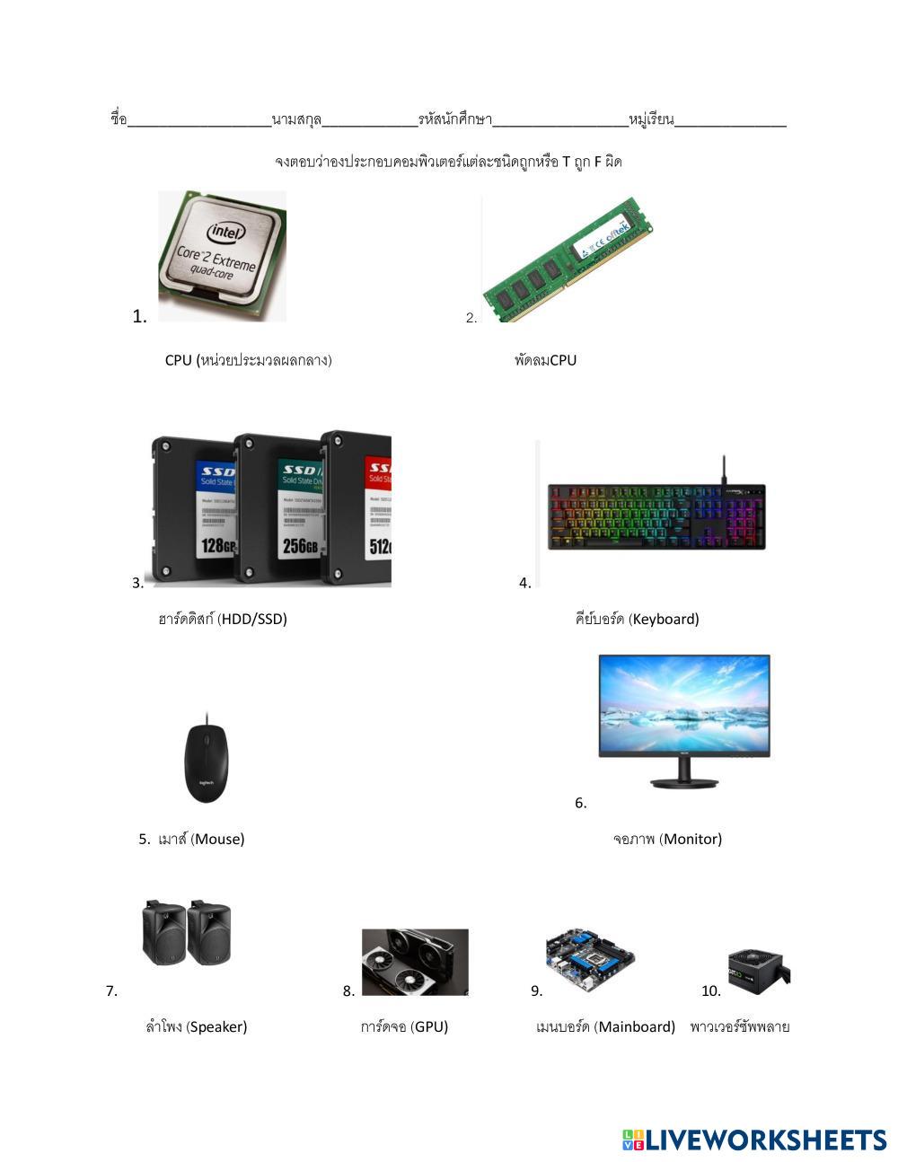 Created byfilm005 องค์ประกอบคอมพิวเตอร์ เกี่ยวกับเนื้อหา องค์ประกอบของคอมพิวเตอร์ Age 10-13 level: 10 Thai Author's Instructions science My Google Classroom Courses × 0 classes selected (0 students total) Quick Access Select all classes (0 classes) All Classes Loading courses... Cancel Share Share to selected Course __COURSE_NAME__ __STUDENT_NAME__ (__STUDENT_EMAIL__) computer Download Worksheet Validation Check my answers Emails my answers to my teacher Full name Group/level School subject Teacher's email or key code Close Submit Validating worksheet... (12) Your answers have been sent to your teacher. Good luck! OK We encountered an error submitting your answers. Please try again. OK Advertisement | Go Ad Free Created byfilm005 องค์ประกอบคอมพิวเตอร์ เกี่ยวกับเนื้อหา องค์ประกอบของคอมพิวเตอร์ Age 10-13 level: 10 Thai Author's Instructions science