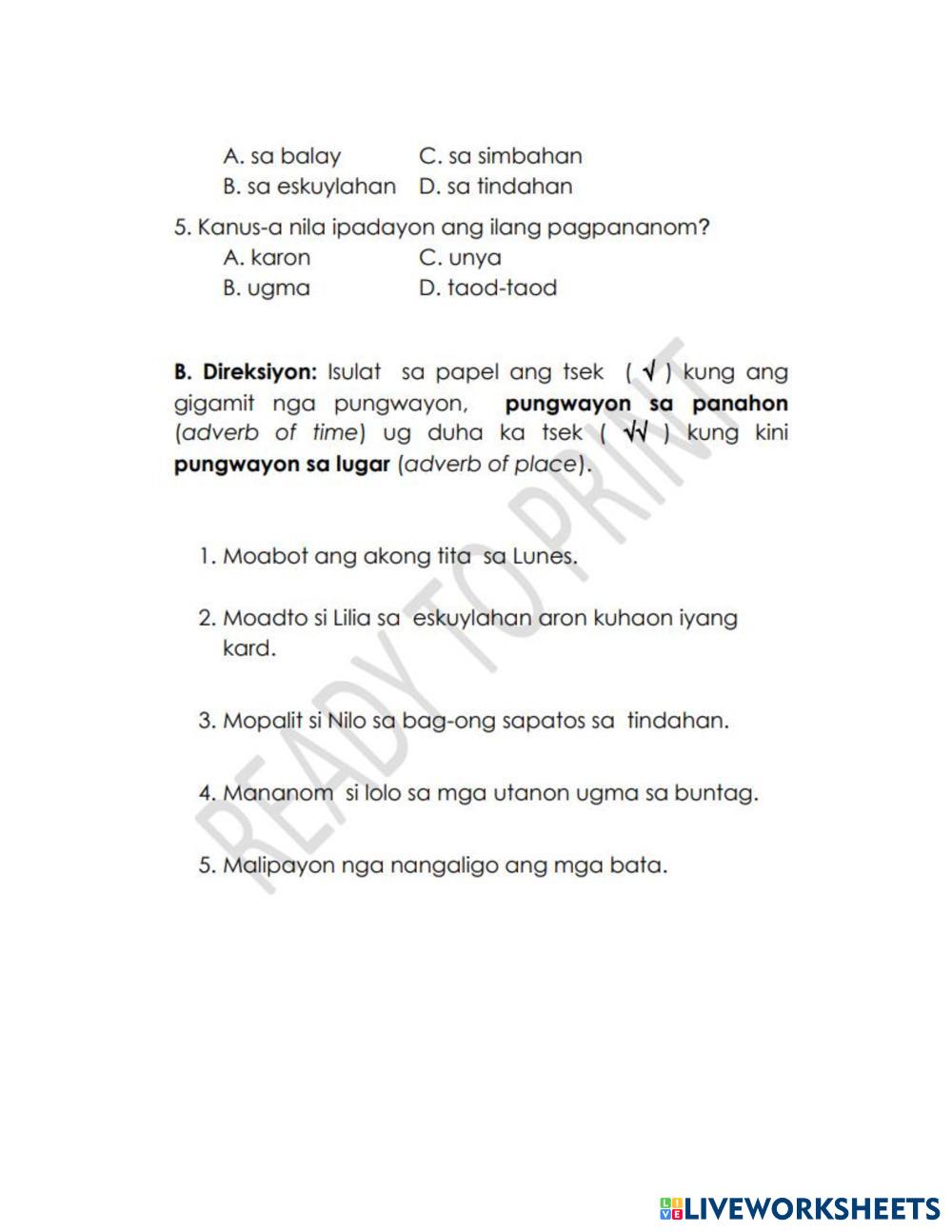 Created byAljene MTB 2 Paggamit sa mga Pungwayon Age 7-11 level: Grade 2 Tagalog Author's Instructions MTB 2 4QM4 - Paggamit sa mga Pungwayon My Google Classroom Courses × 0 classes selected (0 students total) Quick Access Select all classes (0 classes) All Classes Loading courses... Cancel Share Share to selected Course __COURSE_NAME__ __STUDENT_NAME__ (__STUDENT_EMAIL__) MTB 2 4QM4 - Paggamit sa mga Pungwayon Download Worksheet Validation Check my answers Emails my answers to my teacher Full name Group/level School subject Teacher's email or key code Close Submit Validating worksheet... (12) Your answers have been sent to your teacher. Good luck! OK We encountered an error submitting your answers. Please try again. OK Advertisement | Go Ad Free Created byAljene MTB 2 Paggamit sa mga Pungwayon Age 7-11 level: Grade 2 Tagalog Author's Instructions MTB 2 4QM4 - Paggamit sa mga Pungwayon