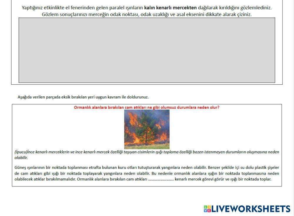 Yaptığınız etkinlikte el fenerinden gelen paralel ışınların ince kenarlı mercekte kırılarak bir noktada toplandığını gözlemlediniz. Gözlem sonuçlarınızı merceğin odak noktası, odak uzaklığı ve asal eksenini dikkate alarak çiziniz.