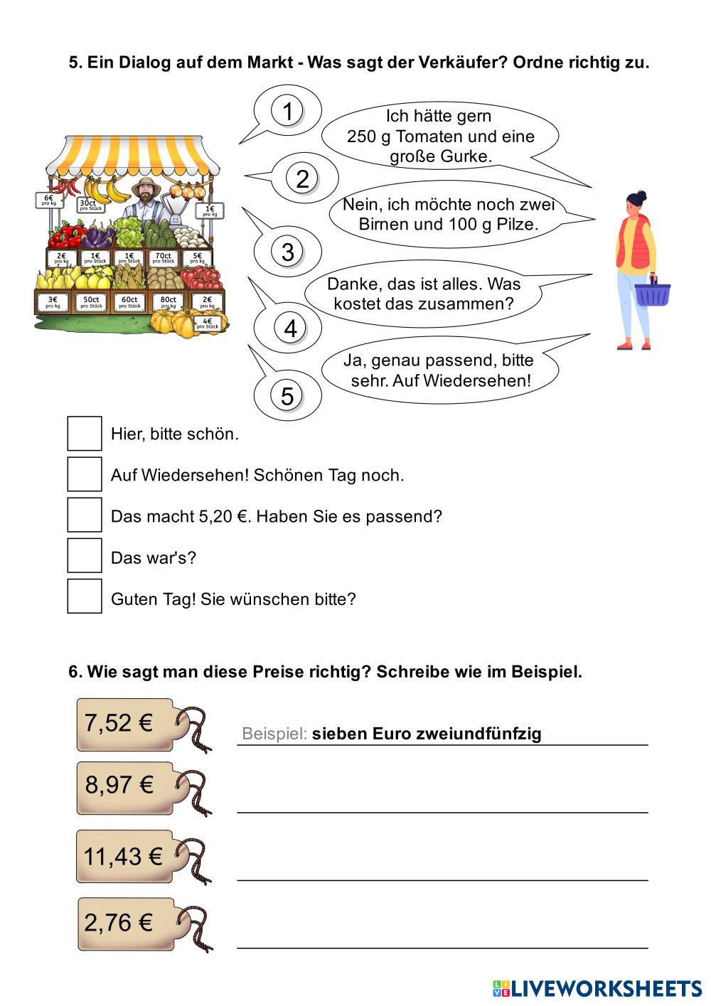 Thema Einkaufen, Preise, Dialog auf dem Markt, Adjektivendungen nach unbestimmten Artikel, Einkaufsliste.