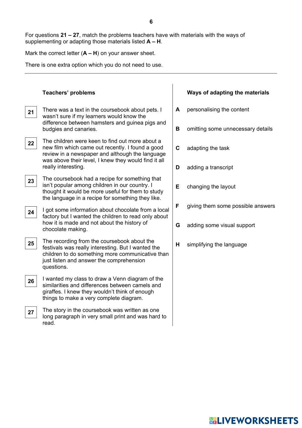 Created byVita English Language High School 12th grade Vocabulary Ukrainian Author's Instructions tests for teachers My Google Classroom Courses × 0 classes selected (0 students total) Quick Access Select all classes (0 classes) All Classes Loading courses... Cancel Share Share to selected Course __COURSE_NAME__ __STUDENT_NAME__ (__STUDENT_EMAIL__) TKT tests 24 Download Worksheet Validation Check my answers Emails my answers to my teacher Full name Group/level School subject Teacher's email or key code Close Submit Validating worksheet... (12) Your answers have been sent to your teacher. Good luck! OK We encountered an error submitting your answers. Please try again. OK Advertisement | Go Ad Free Created byVita English Language High School 12th grade Vocabulary Ukrainian Author's Instructions tests for teachers Explore Worksheets EXTENSION UNIT 1 (M2) English Language 12th grade EXTENSION UNIT 1 (M2) Vocabulary - English Language Complete the blanks with the necessary words. Because / because of English Language 12th grade Because / because of Vocabulary - English Language - PHRASAL VERBS_ 2nd Bach English Language 12th grade PHRASAL VERBS_ 2nd Bach Vocabulary - English Language Fill in the blanks with the necessary word to complete each phrasal verb. Listening quiz 3 INT2 healt problems English Language 12th grade Listening quiz 3 INT2 healt problems Vocabulary - English Language From what you hear, choose the correct option.