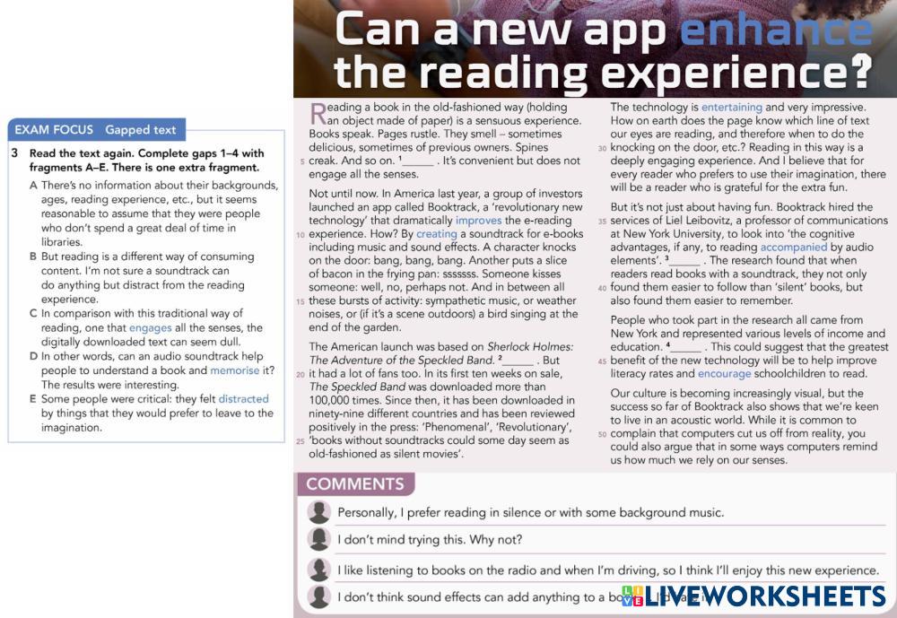 Created byAnna English language Exam focus Age 5-16 level: Intermediate Ukrainian Author's Instructions My Google Classroom Courses × 0 classes selected (0 students total) Quick Access Select all classes (0 classes) All Classes Loading courses... Cancel Share Share to selected Course __COURSE_NAME__ __STUDENT_NAME__ (__STUDENT_EMAIL__) F3 U7.4 Apps. Reading Download Worksheet Validation Check my answers Emails my answers to my teacher Full name Group/level School subject Teacher's email or key code Close Submit Validating worksheet... (12) Your answers have been sent to your teacher. Good luck! OK We encountered an error submitting your answers. Please try again. OK Advertisement | Go Ad Free Created byAnna English language Exam focus Age 5-16 level: Intermediate Ukrainian Author's Instructions