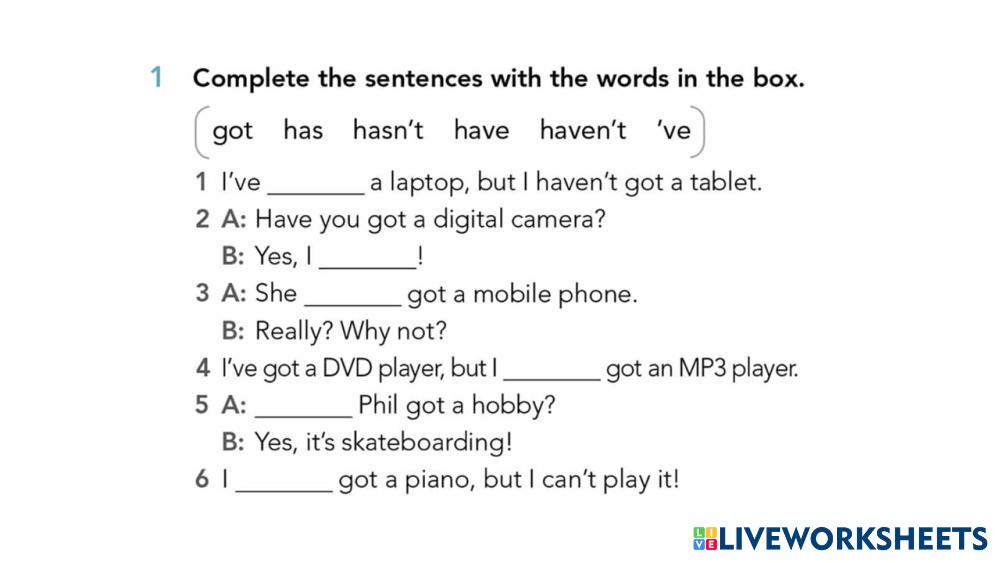 Created byAnna English as a Second Language (ESL) Have got Age 6-16 level: Intermediate Ukrainian Author's Instructions My Google Classroom Courses × 0 classes selected (0 students total) Quick Access Select all classes (0 classes) All Classes Loading courses... Cancel Share Share to selected Course __COURSE_NAME__ __STUDENT_NAME__ (__STUDENT_EMAIL__) F1 U7.0 Gadgets Download Worksheet Validation Check my answers Emails my answers to my teacher Full name Group/level School subject Teacher's email or key code Close Submit Validating worksheet... (12) Your answers have been sent to your teacher. Good luck! OK We encountered an error submitting your answers. Please try again. OK Advertisement | Go Ad Free Created byAnna English as a Second Language (ESL) Have got Age 6-16 level: Intermediate Ukrainian Author's Instructions