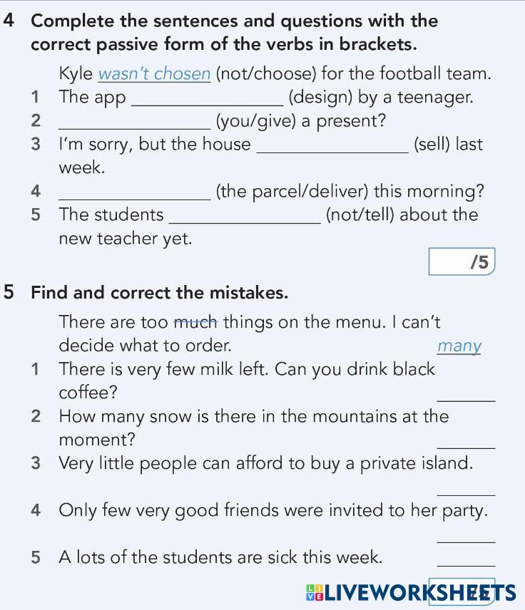 Created byAnna English as a Second Language (ESL) Passive voice Age 14-16 level: Intermediate Ukrainian Author's Instructions My Google Classroom Courses × 0 classes selected (0 students total) Quick Access Select all classes (0 classes) All Classes Loading courses... Cancel Share Share to selected Course __COURSE_NAME__ __STUDENT_NAME__ (__STUDENT_EMAIL__) F2 U7.9 Revision. Homework Download Worksheet Validation Check my answers Emails my answers to my teacher Full name Group/level School subject Teacher's email or key code Close Submit Validating worksheet... (12) Your answers have been sent to your teacher. Good luck! OK We encountered an error submitting your answers. Please try again. OK Advertisement | Go Ad Free Created byAnna English as a Second Language (ESL) Passive voice Age 14-16 level: Intermediate Ukrainian Author's Instructions