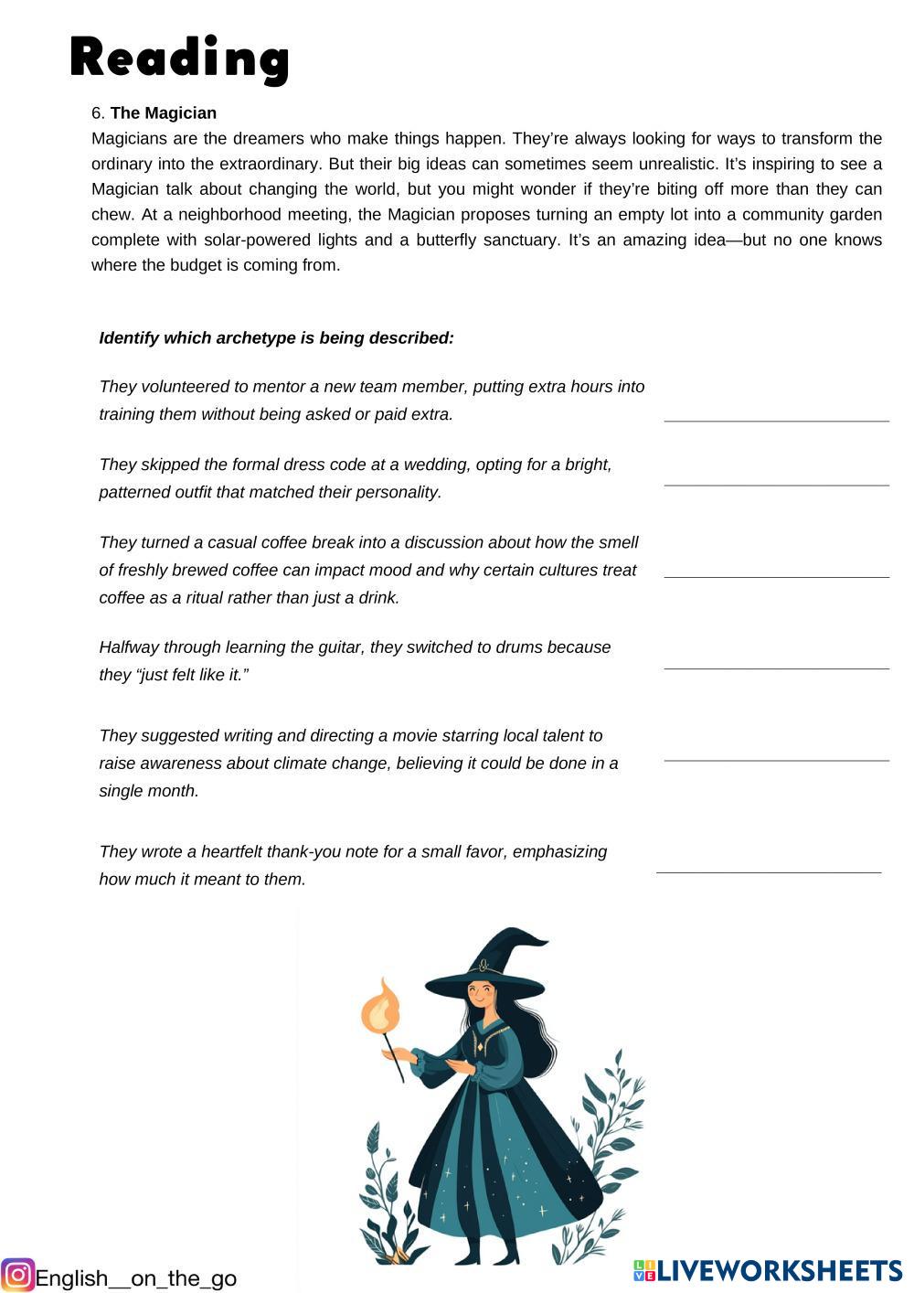 Created by life_line English as a Second Language (ESL) Reading Age 15+ level: intermediate Ukrainian Author's Instructions My Google Classroom Courses × 0 classes selected (0 students total) Quick Access Select all classes (0 classes) All Classes Loading courses... Cancel Share Share to selected Course __COURSE_NAME__ __STUDENT_NAME__ (__STUDENT_EMAIL__) Archetypes (p.1) Download Worksheet Validation Check my answers Emails my answers to my teacher Full name Group/level School subject Teacher's email or key code Close Submit Validating worksheet... (12) Your answers have been sent to your teacher. Good luck! OK We encountered an error submitting your answers. Please try again. OK Advertisement | Go Ad Free Created by life_line English as a Second Language (ESL) Reading Age 15+ level: intermediate Ukrainian Author's Instructions