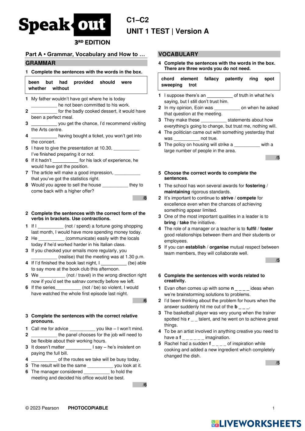 Created by ennoke English as a Second Language (ESL) Unit Test Age 18+ level: c1 Ukrainian Author's Instructions My Google Classroom Courses × 0 classes selected (0 students total) Quick Access Select all classes (0 classes) All Classes Loading courses... Cancel Share Share to selected Course __COURSE_NAME__ __STUDENT_NAME__ (__STUDENT_EMAIL__) Speak out 3 edition Advanced test unit 1 Download Worksheet Validation Check my answers Emails my answers to my teacher Full name Group/level School subject Teacher's email or key code Close Submit Validating worksheet... (12) Your answers have been sent to your teacher. Good luck! OK We encountered an error submitting your answers. Please try again. OK Advertisement | Go Ad Free Created by ennoke English as a Second Language (ESL) Unit Test Age 18+ level: c1 Ukrainian Author's Instructions