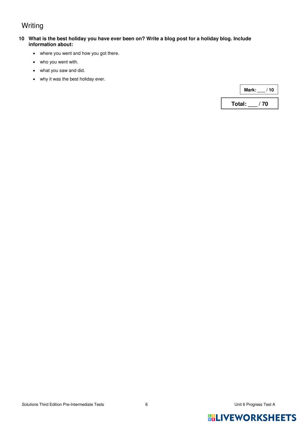 Created by AnnaSolo English as a Second Language (ESL) Sol Pre-Int test 6 Age 14+ level: Sol Pre-Int Ukrainian Author's Instructions My Google Classroom Courses × 0 classes selected (0 students total) Quick Access Select all classes (0 classes) All Classes Loading courses... Cancel Share Share to selected Course __COURSE_NAME__ __STUDENT_NAME__ (__STUDENT_EMAIL__) Solutions Pre_Int Unit 5 test Download Worksheet Validation Check my answers Emails my answers to my teacher Full name Group/level School subject Teacher's email or key code Close Submit Validating worksheet... (12) Your answers have been sent to your teacher. Good luck! OK We encountered an error submitting your answers. Please try again. OK Advertisement | Go Ad Free Created by AnnaSolo English as a Second Language (ESL) Sol Pre-Int test 6 Age 14+ level: Sol Pre-Int Ukrainian Author's Instructions