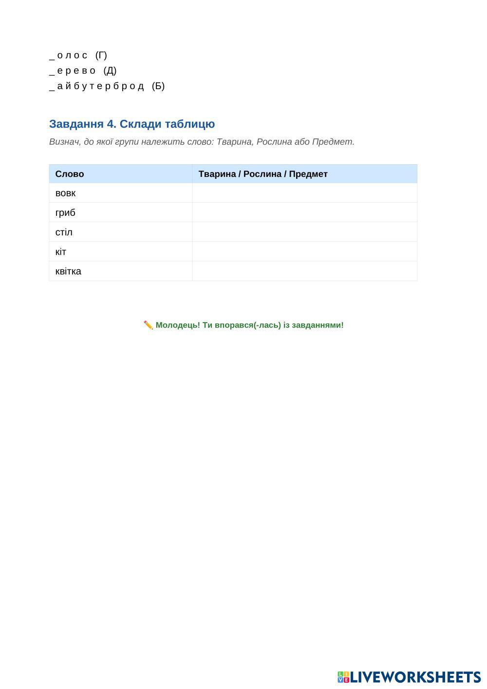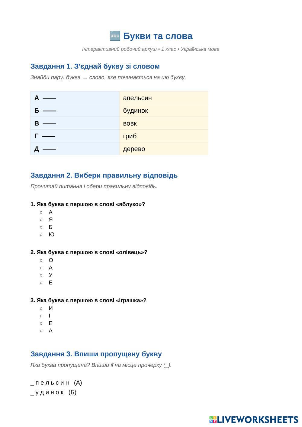Created by 15008 ESL Ukrainian A1 Grammar Ukrainian Author's Instructions Виконай завдання: з'єднай букви зі словами, вибери правильну відповідь та впиши пропущені букви. My Google Classroom Courses × 0 classes selected (0 students total) Quick Access Select all classes (0 classes) All Classes Loading courses... Cancel Share Share to selected Course __COURSE_NAME__ __STUDENT_NAME__ (__STUDENT_EMAIL__) Букви та слова — 1 клас Download Worksheet Validation Check my answers Emails my answers to my teacher Full name Group/level School subject Teacher's email or key code Close Submit Validating worksheet... (12) Your answers have been sent to your teacher. Good luck! OK We encountered an error submitting your answers. Please try again. OK Advertisement | Go Ad Free Created by 15008 ESL Ukrainian A1 Grammar Ukrainian Author's Instructions Виконай завдання: з'єднай букви зі словами, вибери правильну відповідь та впиши пропущені букви. Explore Worksheets Passive Voice: Present Simple, Past Simple, Future Simple ESL A1 Passive Voice: Present Simple, Past Simple, Future Simple Grammar - ESL Choose the verb in the correct tense order of adjectives ESL A1 order of adjectives Grammar - ESL Practice the order of more the one adjective in the sentence. Прислівники частотності з to be ESL A1 Прислівники частотності з to be Grammar - ESL Склади речення з наданих слів, виставивши слова у правильному порядку. My friends and me. Test ESL A1 My friends and me. Test Grammar - ESL Choosing an odd word. Matching pictures to theirs titles. Completing sentences with to be. Reading and choosing the correct option. Matching the halves of sentences.