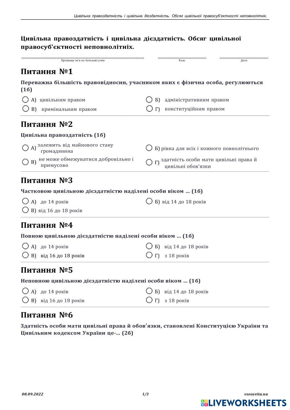 Created by olenazhyrba History World history Age 14-18 level: 9 Ukrainian Author's Instructions My Google Classroom Courses × 0 classes selected (0 students total) Quick Access Select all classes (0 classes) All Classes Loading courses... Cancel Share Share to selected Course __COURSE_NAME__ __STUDENT_NAME__ (__STUDENT_EMAIL__) Цивільна правоздатність та дієздатність Download Worksheet Validation Check my answers Emails my answers to my teacher Full name Group/level School subject Teacher's email or key code Close Submit Validating worksheet... (12) Your answers have been sent to your teacher. Good luck! OK We encountered an error submitting your answers. Please try again. OK Advertisement | Go Ad Free Created by olenazhyrba History World history Age 14-18 level: 9 Ukrainian Author's Instructions