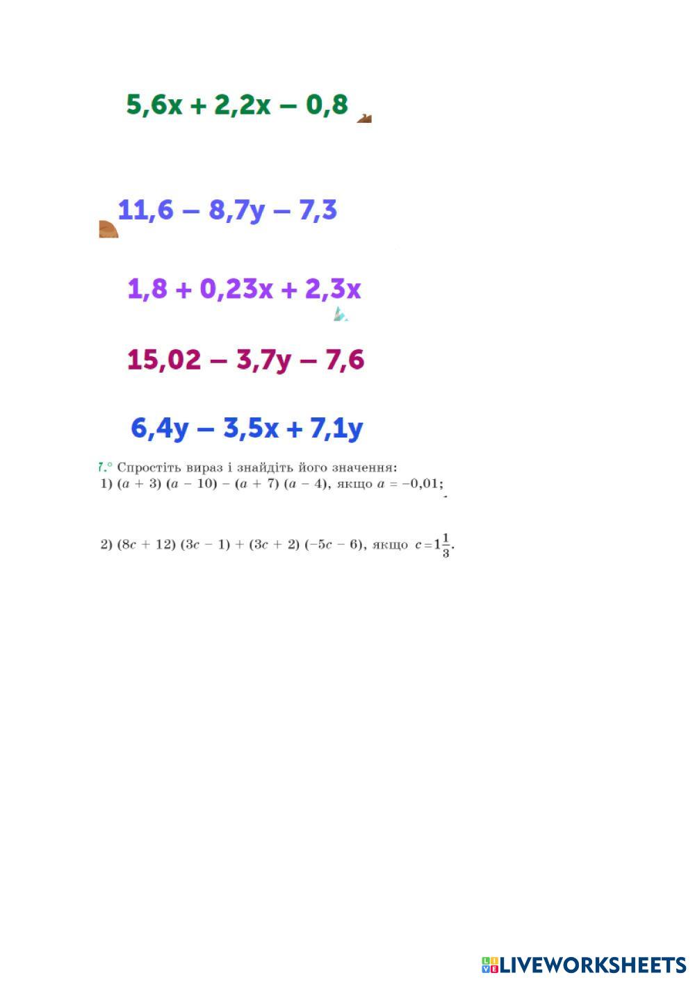 Created by getmanyukoi Mathematics Mathematics Age 12-11 level: 7 Ukrainian Author's Instructions My Google Classroom Courses × 0 classes selected (0 students total) Quick Access Select all classes (0 classes) All Classes Loading courses... Cancel Share Share to selected Course __COURSE_NAME__ __STUDENT_NAME__ (__STUDENT_EMAIL__) Спрощення многочленів Download Worksheet Validation Check my answers Emails my answers to my teacher Full name Group/level School subject Teacher's email or key code Close Submit Validating worksheet... (12) Your answers have been sent to your teacher. Good luck! OK We encountered an error submitting your answers. Please try again. OK Advertisement | Go Ad Free Created by getmanyukoi Mathematics Mathematics Age 12-11 level: 7 Ukrainian Author's Instructions