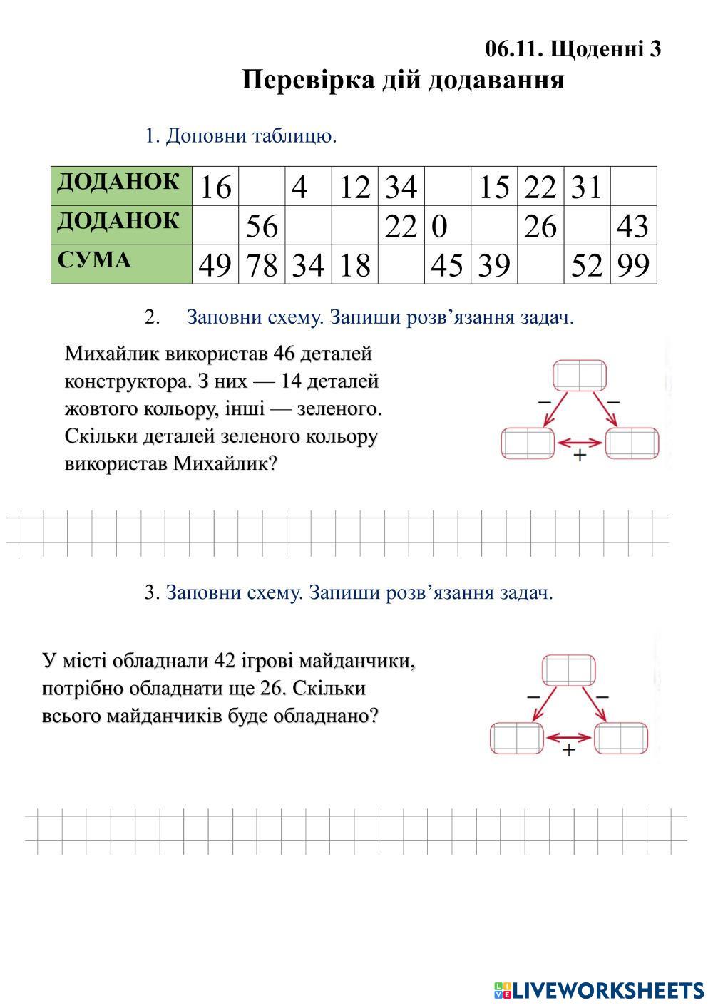 Created by Valeri_M Обислювальні навички Перевірка дій додавання Age 7-12 level: 2 Ukrainian Author's Instructions My Google Classroom Courses × 0 classes selected (0 students total) Quick Access Select all classes (0 classes) All Classes Loading courses... Cancel Share Share to selected Course __COURSE_NAME__ __STUDENT_NAME__ (__STUDENT_EMAIL__) 06.11. Щоденні 3 Download Worksheet Validation Check my answers Emails my answers to my teacher Full name Group/level School subject Teacher's email or key code Close Submit Validating worksheet... (12) Your answers have been sent to your teacher. Good luck! OK We encountered an error submitting your answers. Please try again. OK Advertisement | Go Ad Free Created by Valeri_M Обислювальні навички Перевірка дій додавання Age 7-12 level: 2 Ukrainian Author's Instructions