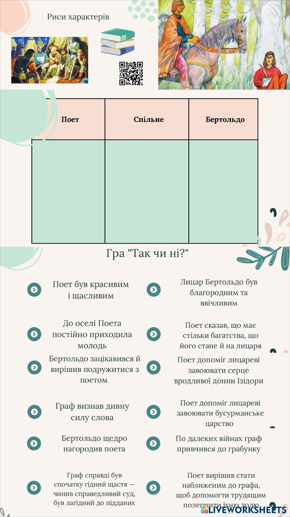 Created bySvitlana Українська література Аналіз твору Age 13-17 level: 8 клас Ukrainian Author's Instructions Аналіз образів Поета і Бертольдо My Google Classroom Courses × 0 classes selected (0 students total) Quick Access Select all classes (0 classes) All Classes Loading courses... Cancel Share Share to selected Course __COURSE_NAME__ __STUDENT_NAME__ (__STUDENT_EMAIL__) Леся Українка "Давня казка" Download Worksheet Validation Check my answers Emails my answers to my teacher Full name Group/level School subject Teacher's email or key code Close Submit Validating worksheet... (12) Your answers have been sent to your teacher. Good luck! OK We encountered an error submitting your answers. Please try again. OK Advertisement | Go Ad Free Created bySvitlana Українська література Аналіз твору Age 13-17 level: 8 клас Ukrainian Author's Instructions Аналіз образів Поета і Бертольдо