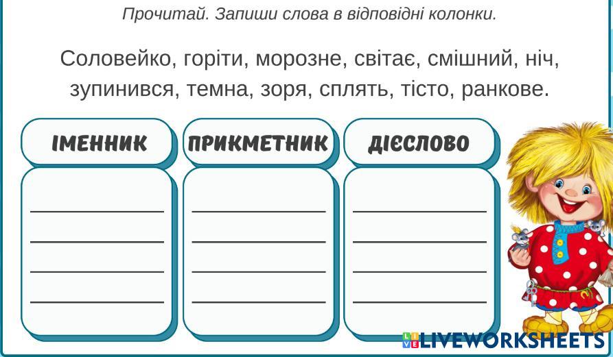 Created byГанна Осадча Ukranian Language Language Age 8-12 level: 3 Ukrainian Author's Instructions My Google Classroom Courses × 0 classes selected (0 students total) Quick Access Select all classes (0 classes) All Classes Loading courses... Cancel Share Share to selected Course __COURSE_NAME__ __STUDENT_NAME__ (__STUDENT_EMAIL__) Досліджую слова Download Worksheet Validation Check my answers Emails my answers to my teacher Full name Group/level School subject Teacher's email or key code Close Submit Validating worksheet... (12) Your answers have been sent to your teacher. Good luck! OK We encountered an error submitting your answers. Please try again. OK Advertisement | Go Ad Free Created byГанна Осадча Ukranian Language Language Age 8-12 level: 3 Ukrainian Author's Instructions