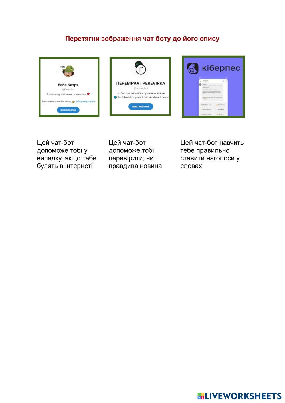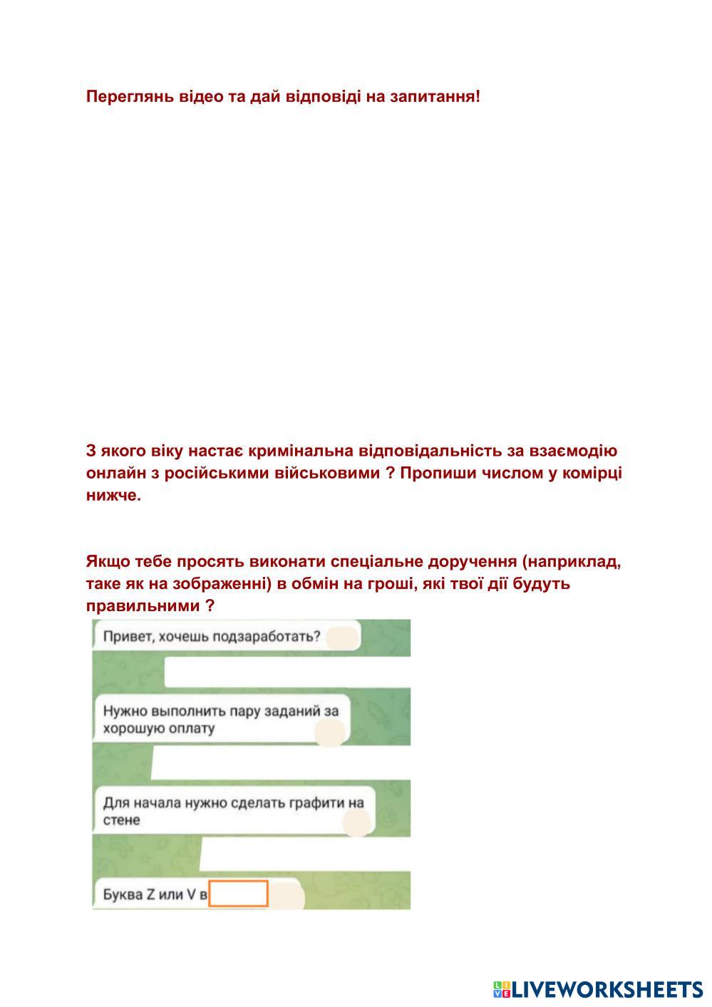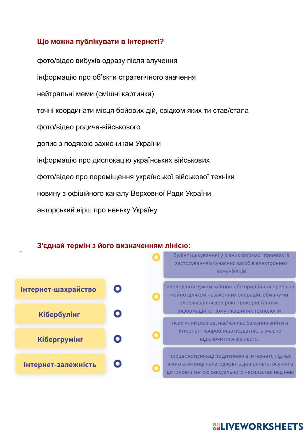 Created by LaraMarko Виховна робота Пам'ятка Age 10+ level: 5-9 Ukrainian Author's Instructions My Google Classroom Courses × 0 classes selected (0 students total) Quick Access Select all classes (0 classes) All Classes Loading courses... Cancel Share Share to selected Course __COURSE_NAME__ __STUDENT_NAME__ (__STUDENT_EMAIL__) Моя безпека в інтернеті Download Worksheet Validation Check my answers Emails my answers to my teacher Full name Group/level School subject Teacher's email or key code Close Submit Validating worksheet... (12) Your answers have been sent to your teacher. Good luck! OK We encountered an error submitting your answers. Please try again. OK Advertisement | Go Ad Free Created by LaraMarko Виховна робота Пам'ятка Age 10+ level: 5-9 Ukrainian Author's Instructions