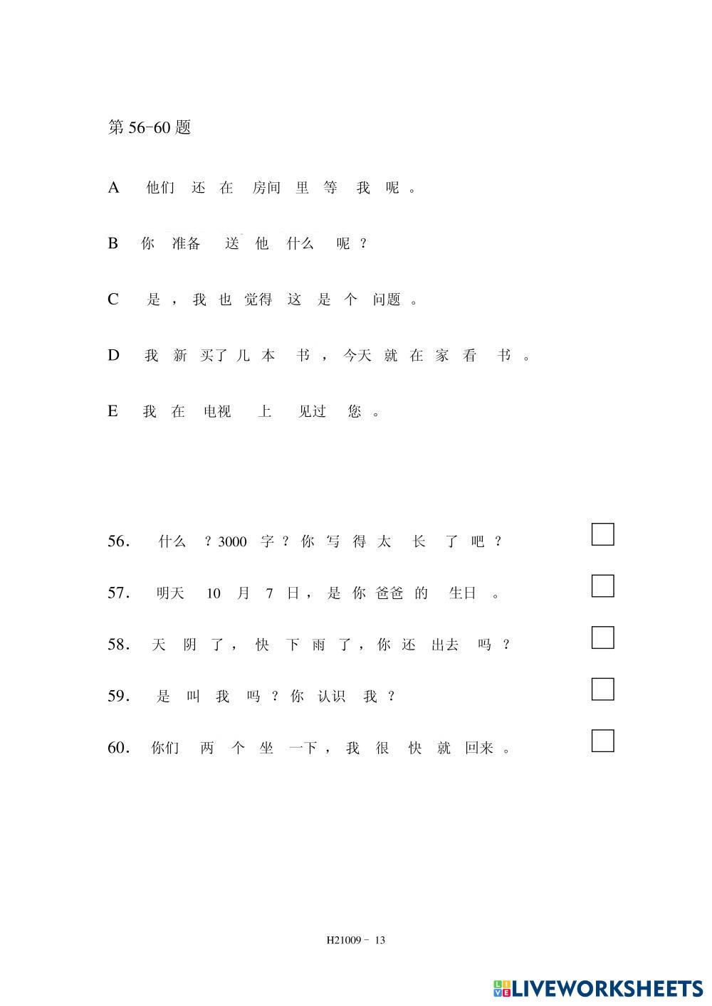 Created by hang1501 Chinese HSK2 Age 3+ level: HSK2 Vietnamese Author's Instructions My Google Classroom Courses × 0 classes selected (0 students total) Quick Access Select all classes (0 classes) All Classes Loading courses... Cancel Share Share to selected Course __COURSE_NAME__ __STUDENT_NAME__ (__STUDENT_EMAIL__) H21009 Download Worksheet Validation Check my answers Emails my answers to my teacher Full name Group/level School subject Teacher's email or key code Close Submit Validating worksheet... (12) Your answers have been sent to your teacher. Good luck! OK We encountered an error submitting your answers. Please try again. OK Advertisement | Go Ad Free Created by hang1501 Chinese HSK2 Age 3+ level: HSK2 Vietnamese Author's Instructions