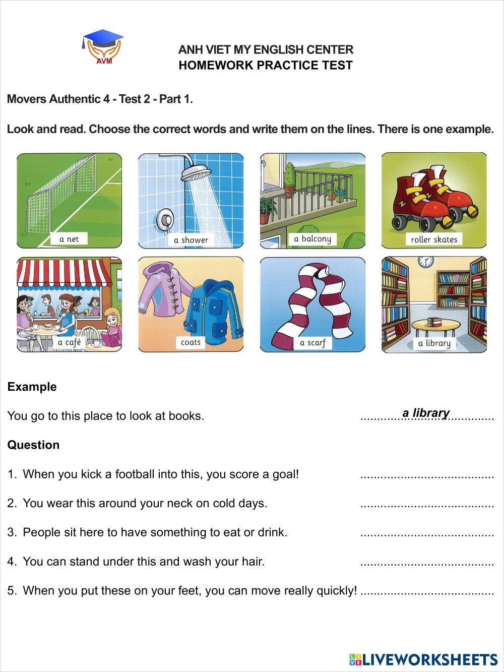 Created byAnhvietmy English Language Elementary 3rd grade Phonics Vietnamese Author's Instructions . My Google Classroom Courses × 0 classes selected (0 students total) Quick Access Select all classes (0 classes) All Classes Loading courses... Cancel Share Share to selected Course __COURSE_NAME__ __STUDENT_NAME__ (__STUDENT_EMAIL__) MOVERS AUTH 4-TEST 2-R&W-PART 1 Download Worksheet Validation Check my answers Emails my answers to my teacher Full name Group/level School subject Teacher's email or key code Close Submit Validating worksheet... (12) Your answers have been sent to your teacher. Good luck! OK We encountered an error submitting your answers. Please try again. OK Advertisement | Go Ad Free Created byAnhvietmy English Language Elementary 3rd grade Phonics Vietnamese Author's Instructions . Explore Worksheets MOVERS AUTH 4-TEST 2-R&W-PART 4 English Language 3rd grade MOVERS AUTH 4-TEST 2-R&W-PART 4 Phonics - English Language . MOVERS AUTH 4-TEST 2-R&W-PART 2 English Language 3rd grade MOVERS AUTH 4-TEST 2-R&W-PART 2 Phonics - English Language , PHONETICS - 5 English Language 3rd grade PHONETICS - 5 Phonics - English Language PRONOUNCE THE WORD AND SPELL IT CORRECTLY Phonetics - 4 English Language 3rd grade Phonetics - 4 Phonics - English Language Write the correct spelling and pronounce the word