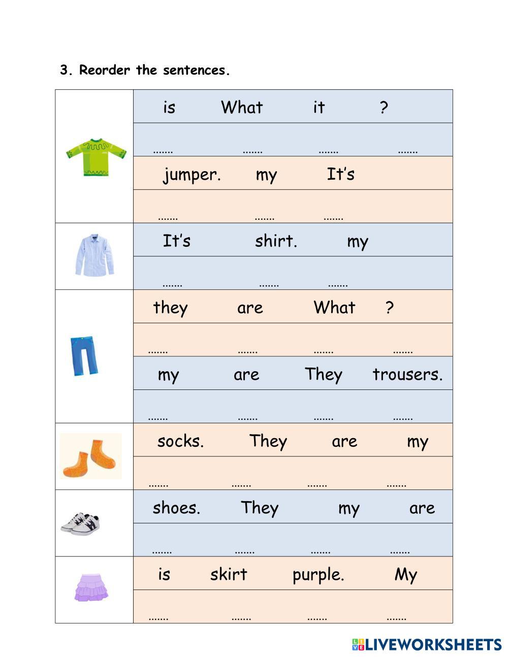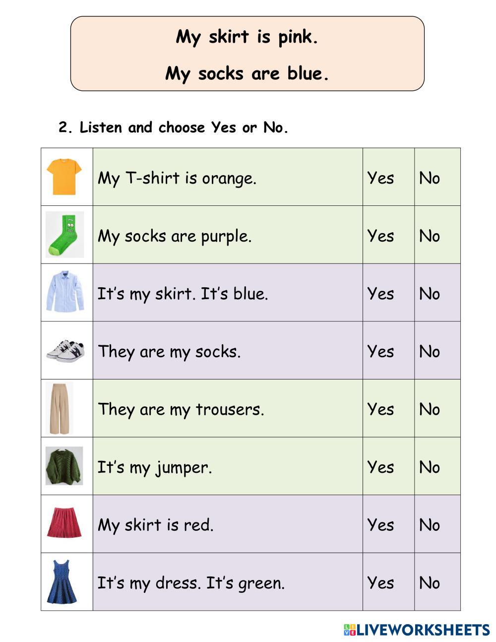Created by Dangnhan English as a Second Language (ESL) Clothes Age 6-10 level: 1 Vietnamese Author's Instructions My Google Classroom Courses × 0 classes selected (0 students total) Quick Access Select all classes (0 classes) All Classes Loading courses... Cancel Share Share to selected Course __COURSE_NAME__ __STUDENT_NAME__ (__STUDENT_EMAIL__) Clothes Download Worksheet Validation Check my answers Emails my answers to my teacher Full name Group/level School subject Teacher's email or key code Close Submit Validating worksheet... (12) Your answers have been sent to your teacher. Good luck! OK We encountered an error submitting your answers. Please try again. OK Advertisement | Go Ad Free Created by Dangnhan English as a Second Language (ESL) Clothes Age 6-10 level: 1 Vietnamese Author's Instructions