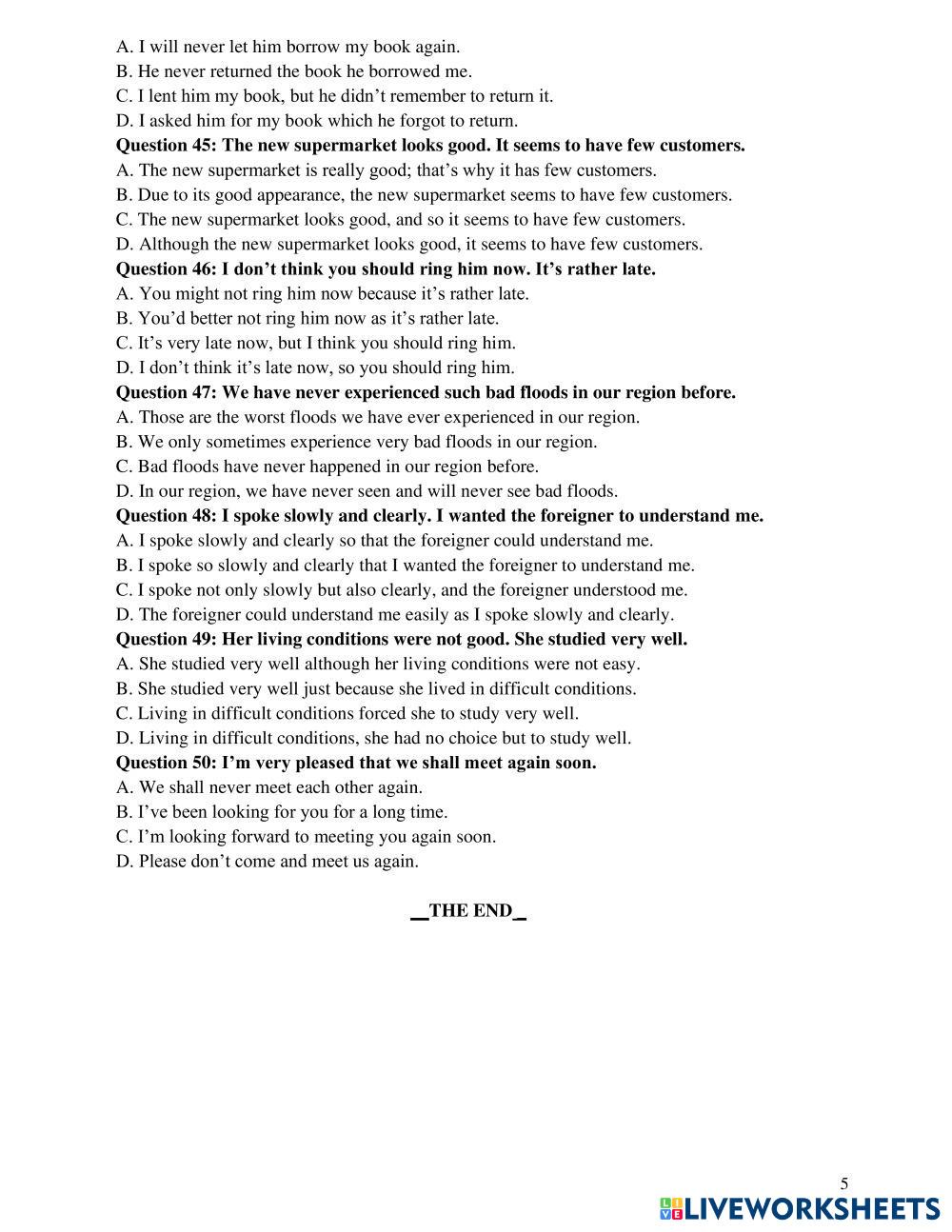 Created byPhan Anh English as a second language Monthly test for grade 8 students Age 10-17 level: Pre-intermediate Vietnamese Author's Instructions My Google Classroom Courses × 0 classes selected (0 students total) Quick Access Select all classes (0 classes) All Classes Loading courses... Cancel Share Share to selected Course __COURSE_NAME__ __STUDENT_NAME__ (__STUDENT_EMAIL__) Kiểm tra tháng 3 Download Worksheet Validation Check my answers Emails my answers to my teacher Full name Group/level School subject Teacher's email or key code Close Submit Validating worksheet... (12) Your answers have been sent to your teacher. Good luck! OK We encountered an error submitting your answers. Please try again. OK Advertisement | Go Ad Free Created byPhan Anh English as a second language Monthly test for grade 8 students Age 10-17 level: Pre-intermediate Vietnamese Author's Instructions