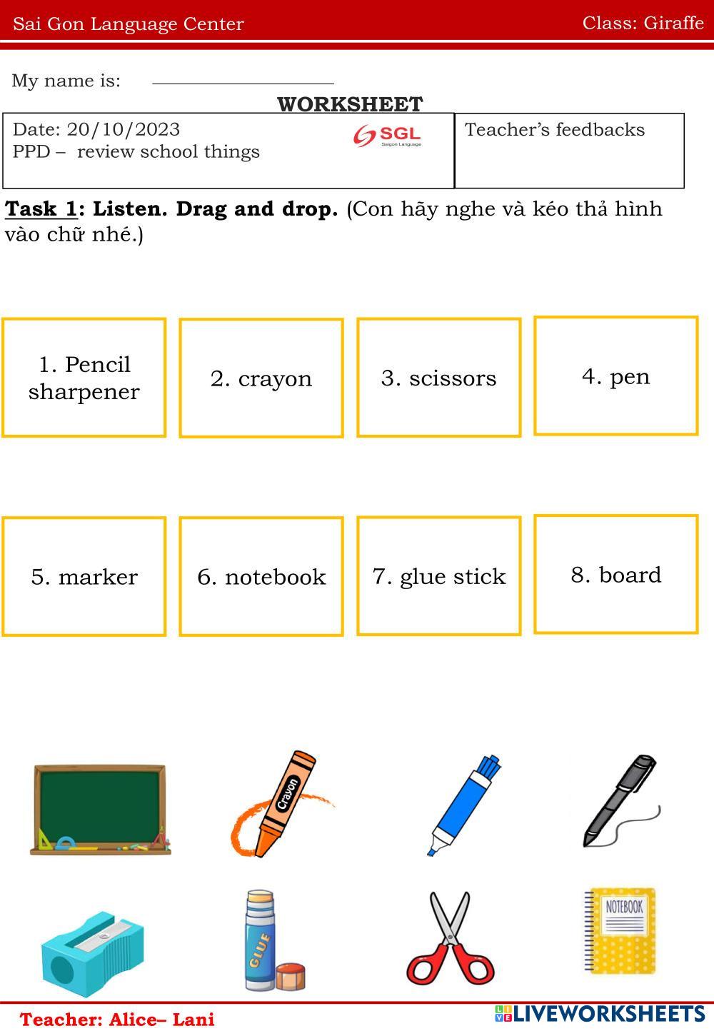 Created byNguyễn Thị ThanhThao english schoolthings Age 5-9 level: ppd b5 Vietnamese Author's Instructions schoolthings My Google Classroom Courses × 0 classes selected (0 students total) Quick Access Select all classes (0 classes) All Classes Loading courses... Cancel Share Share to selected Course __COURSE_NAME__ __STUDENT_NAME__ (__STUDENT_EMAIL__) Homework Download Worksheet Validation Check my answers Emails my answers to my teacher Full name Group/level School subject Teacher's email or key code Close Submit Validating worksheet... (12) Your answers have been sent to your teacher. Good luck! OK We encountered an error submitting your answers. Please try again. OK Advertisement | Go Ad Free Created byNguyễn Thị ThanhThao english schoolthings Age 5-9 level: ppd b5 Vietnamese Author's Instructions schoolthings