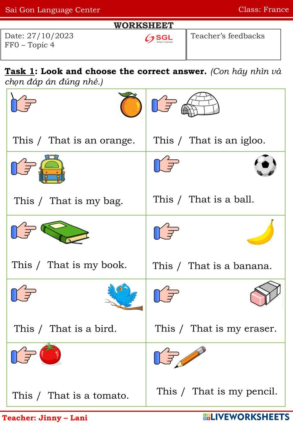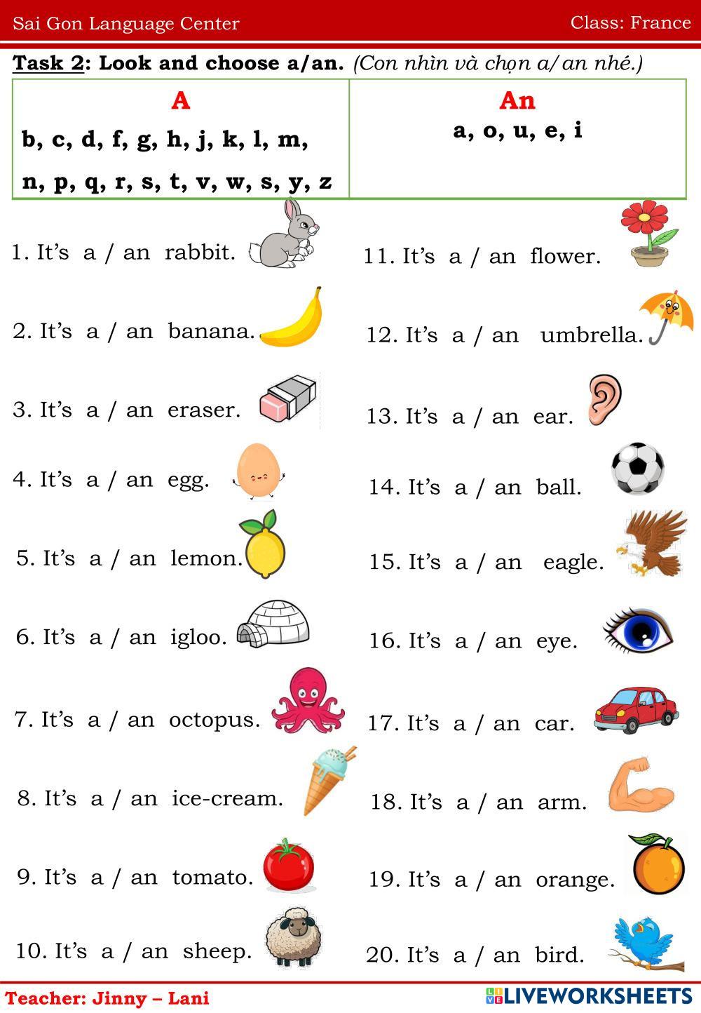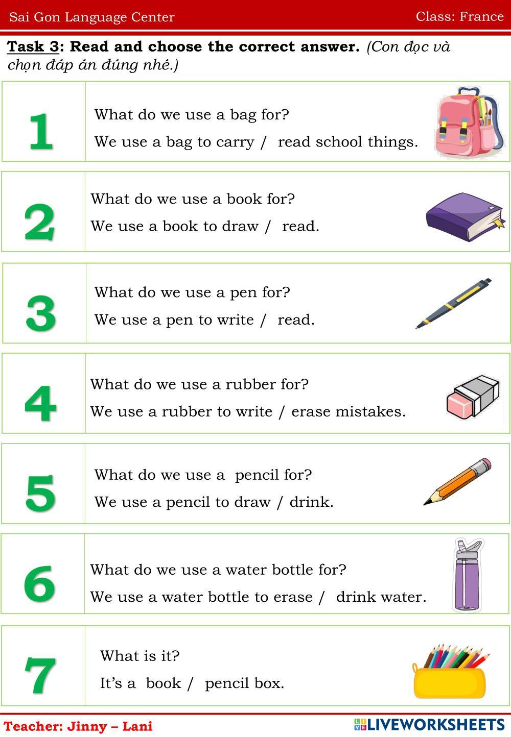 Created byNguyễn Thị ThanhThao english homework Age 6-10 level: FFO TOPIC 4 Vietnamese Author's Instructions homework My Google Classroom Courses × 0 classes selected (0 students total) Quick Access Select all classes (0 classes) All Classes Loading courses... Cancel Share Share to selected Course __COURSE_NAME__ __STUDENT_NAME__ (__STUDENT_EMAIL__) homework Download Worksheet Validation Check my answers Emails my answers to my teacher Full name Group/level School subject Teacher's email or key code Close Submit Validating worksheet... (12) Your answers have been sent to your teacher. Good luck! OK We encountered an error submitting your answers. Please try again. OK Advertisement | Go Ad Free Created byNguyễn Thị ThanhThao english homework Age 6-10 level: FFO TOPIC 4 Vietnamese Author's Instructions homework