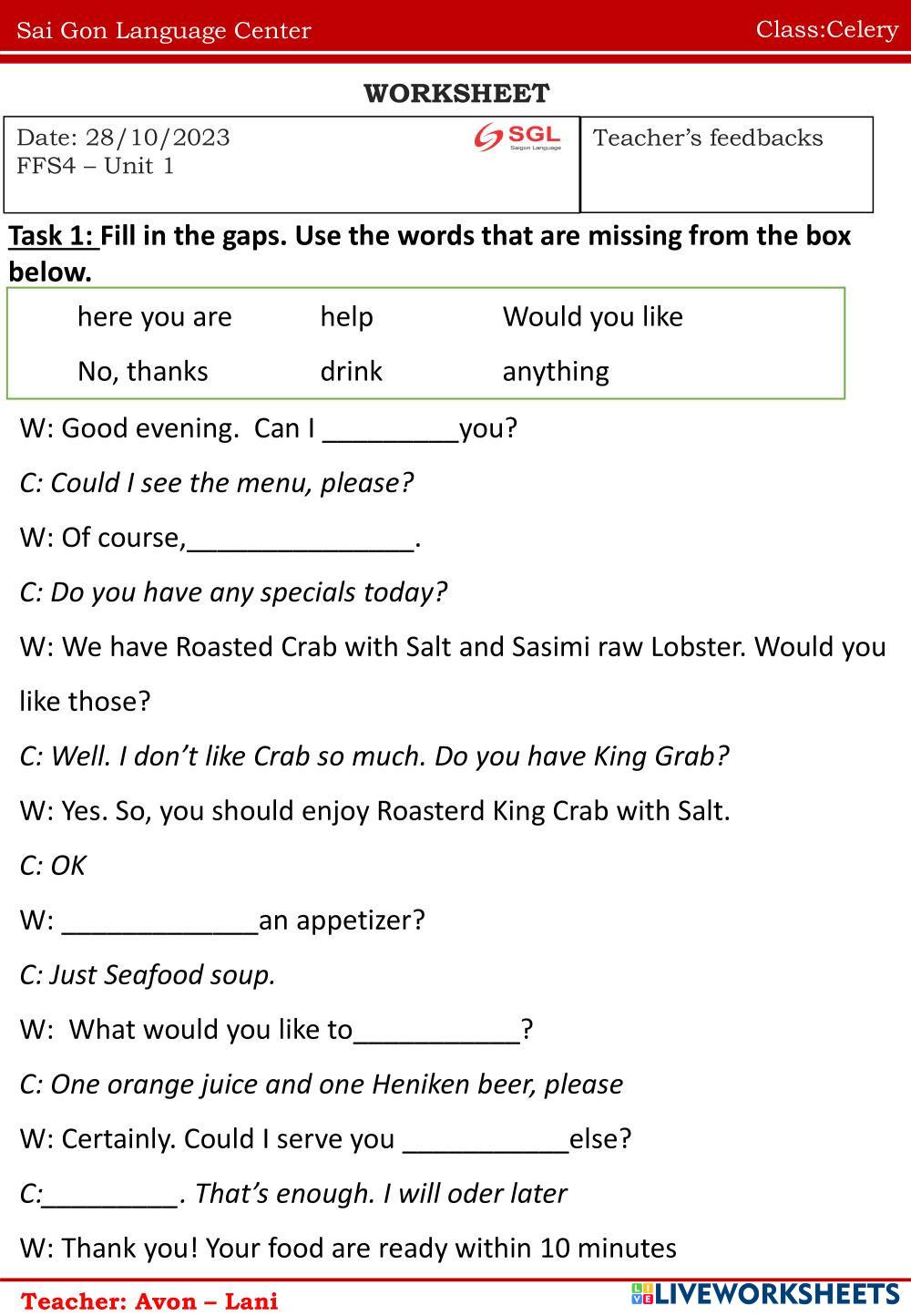 Created byNguyễn Thị ThanhThao english homework Age 10-15 level: ffs4 Vietnamese Author's Instructions homework My Google Classroom Courses × 0 classes selected (0 students total) Quick Access Select all classes (0 classes) All Classes Loading courses... Cancel Share Share to selected Course __COURSE_NAME__ __STUDENT_NAME__ (__STUDENT_EMAIL__) Homework Download Worksheet Validation Check my answers Emails my answers to my teacher Full name Group/level School subject Teacher's email or key code Close Submit Validating worksheet... (12) Your answers have been sent to your teacher. Good luck! OK We encountered an error submitting your answers. Please try again. OK Advertisement | Go Ad Free Created byNguyễn Thị ThanhThao english homework Age 10-15 level: ffs4 Vietnamese Author's Instructions homework